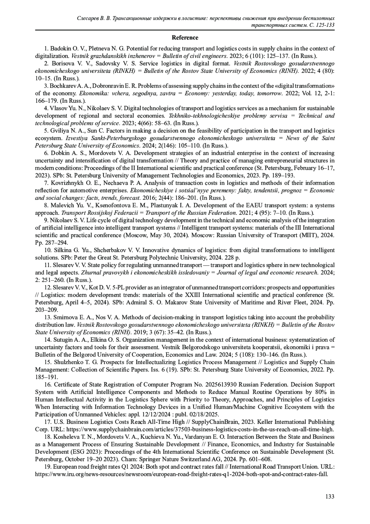 1. Бадокин О. В., Плетнева Н. Г. Потенциал снижения транспортно-логистических затрат в цепях поставок в условиях цифровизации // Вестник гражданских инженеров. 2023. № 6(101). С. 125-137.