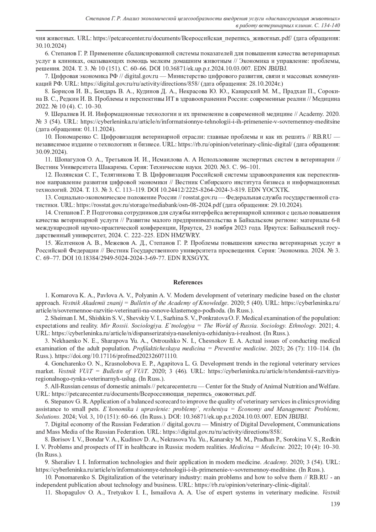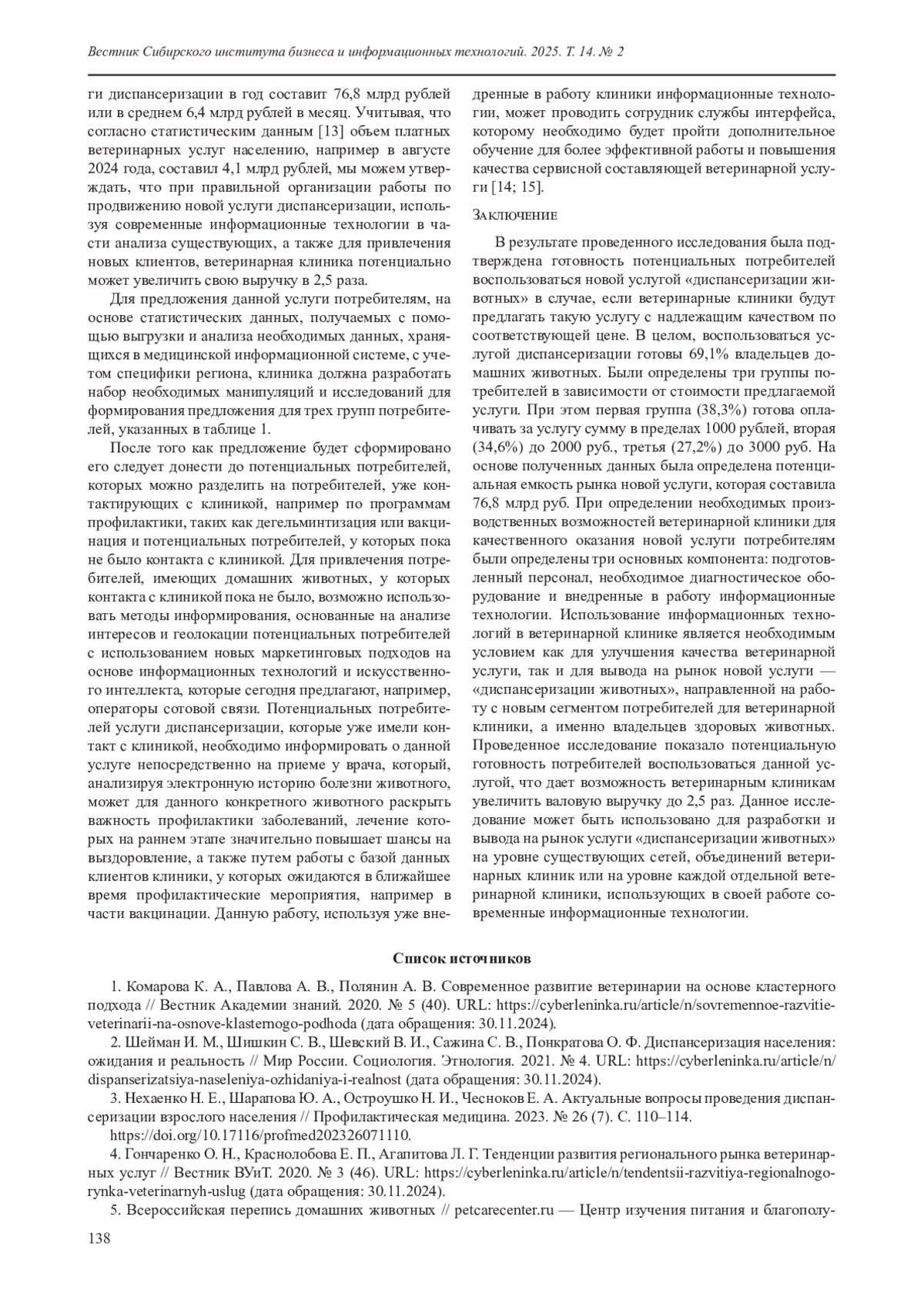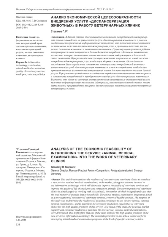 СТЕПАНОВ Г. Р. АНАЛИЗ ЭКОНОМИЧЕСКОЙ ЦЕЛЕСООБРАЗНОСТИ ВНЕДРЕНИЯ УСЛУГИ «ДИСПАНСЕРИЗАЦИЯ ЖИВОТНЫХ» В РАБОТУ ВЕТЕРИНАРНЫХ КЛИНИК // ВЕСТНИК СИБИРСКОГО ИНСТИТУТА БИЗНЕСА И ИНФОРМАЦИОННЫХ ТЕХНОЛОГИЙ. 2025. ТОМ 14, № 2
