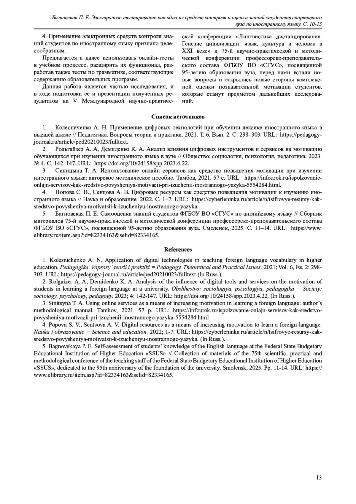 5. Багновская П. Е. Самооценка знаний студентов ФГБОУ ВО «СГУС» по английскому языку // Сборник материалов 75-й научно-практической и методической конференции профессорско-преподавательского состава ФГБОУ ВО «СГУС», посвященной 95-летию образования вуза. Смоленск, 2025. С. 11-14. URL: https://www.elibrary.ru/item.asp?id=82334163&selid=82334165.