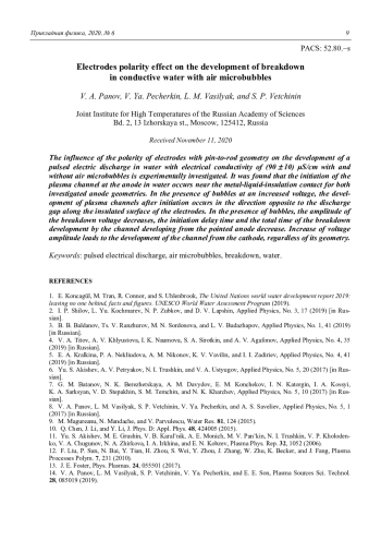 14. Panov V. A., Vasilyak L. M., Vetchinin S. P., Pecherkin V. Ya., Son E. E. // Plasma Sources Sci. Technol. 2019. Vol. 28. P. 085019.