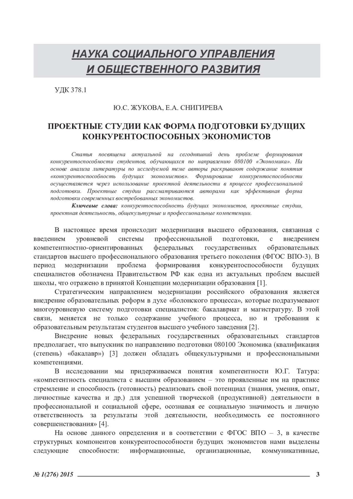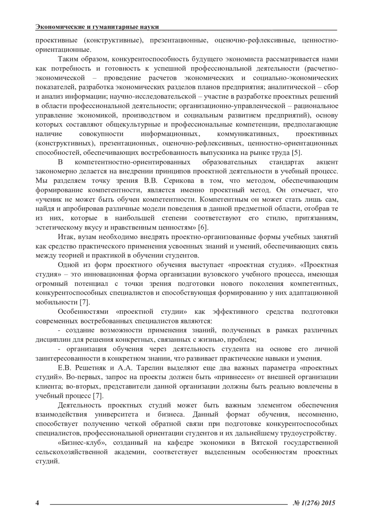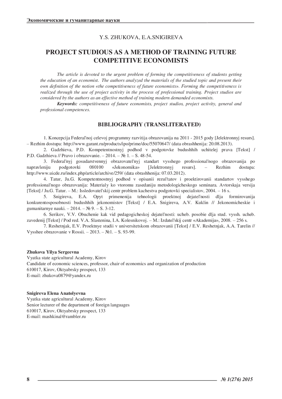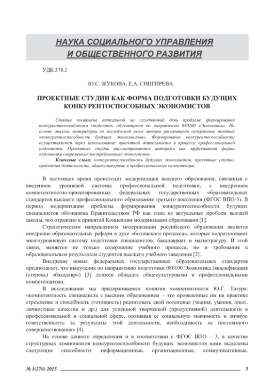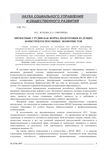 ЖУКОВА Ю. С., СНИГИРЕВА Е. А. ПРОЕКТНЫЕ СТУДИИ КАК ФОРМА ПОДГОТОВКИ БУДУЩИХ КОНКУРЕНТОСПОСОБНЫХ ЭКОНОМИСТОВ // ЭКОНОМИЧЕСКИЕ И ГУМАНИТАРНЫЕ НАУКИ. 2015. № 1 (276)