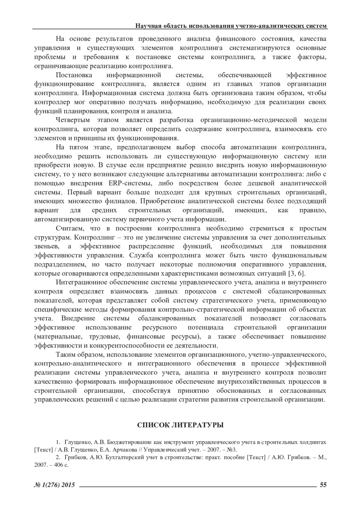 1. Глущенко, А.В. Бюджетирование как инструмент управленческого учета в строительных холдингах [Текст] / А.В. Глущенко, Е.А. Арчакова // Управленческий учет. - 2007. - №3.
