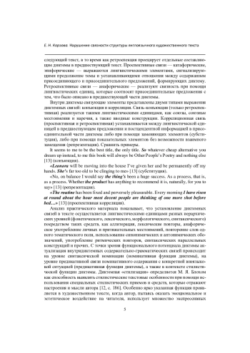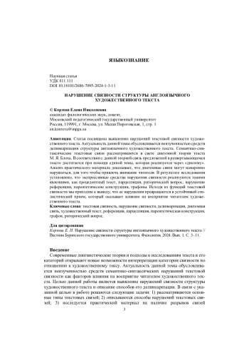 Современные лингвистические теории и подходы к исследованиям текста и его категорий открывают новые возможности интерпретации категории связности по отношению к художественному тексу. Актуальность данной темы обусловливается неизученностью средств семантико-синтаксических нарушений текстовой связности как факторов влияния на восприятие читателем художественного текста.
