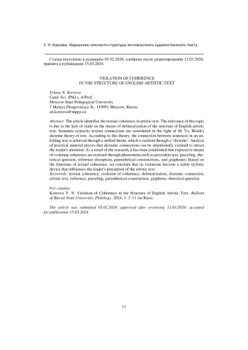 Статья посвящена выявлению нарушений текстовой связности художественного текста. Актуальность данной темы обусловливается неизученностью средств делинеаризации структуры англоязычного художественного текста. Семантико-синтаксические текстовые связи рассматриваются в свете диктемной теории текста М. Я. Блоха. В соответствии с данной теорией связь предложений в развертывающемся тексте достигается при помощи единой темы, которая реализуется через «диктему». Анализ практического материала доказывает, что диктемные связи могут намеренно нарушаться, для того чтобы привлечь внимание читателя. В результате исследования установлено, что экспрессивные средства нарушения связности реализуются такими явлениями, как прецедентный текст, парцелляция, риторический вопрос, нарушение референции, парентетические конструкции, графоны. Исходя из функций текстовой связности мы приходим к выводу, что ее нарушения превращаются в устойчивый стилистический прием, который оказывает влияние на восприятие читателем художественного текста.