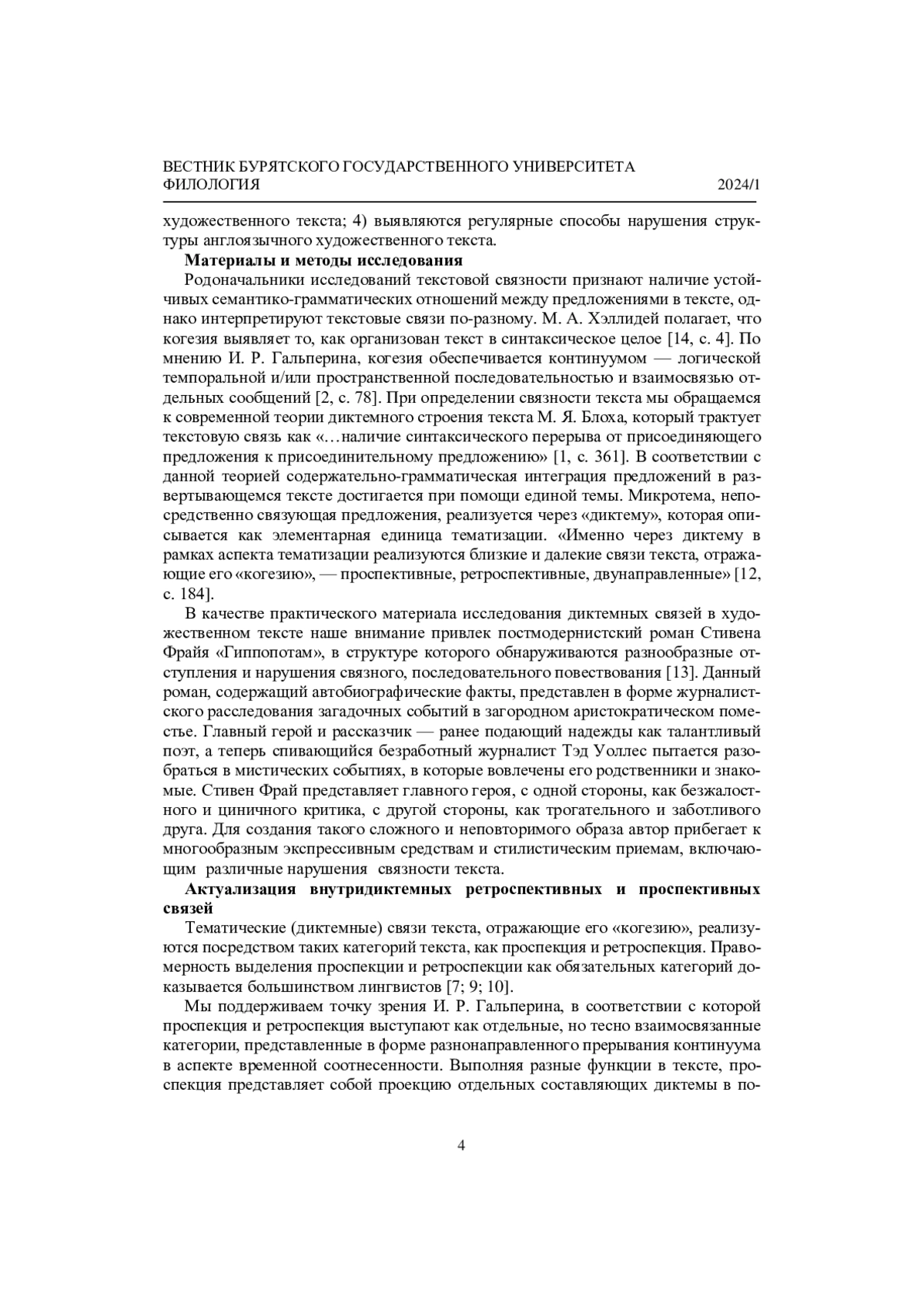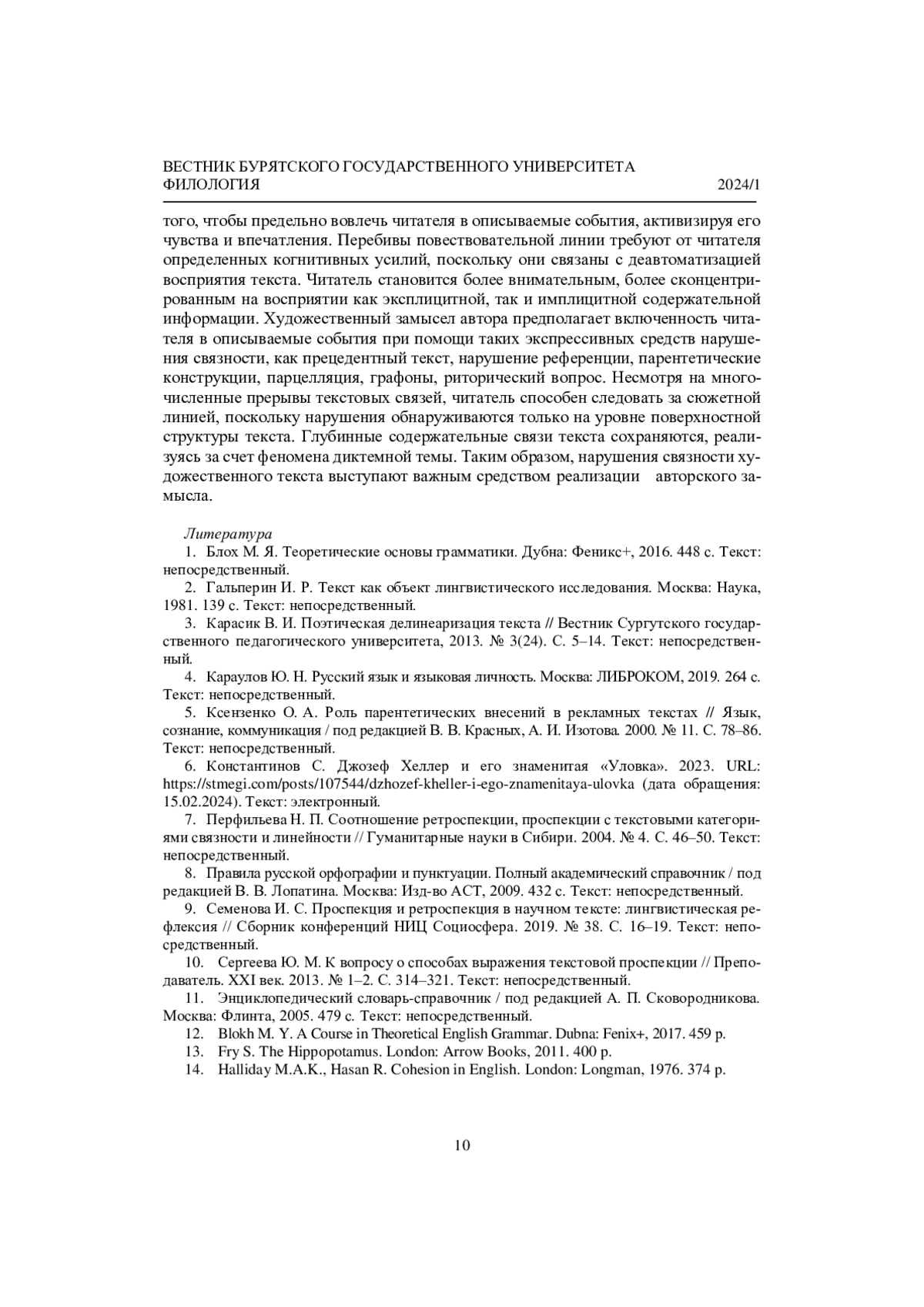 7. Перфильева Н. П. Соотношение ретроспекции, проспекции с текстовыми категориями связности и линейности // Гуманитарные науки в Сибири. 2004. № 4. С. 46-50. Текст: непосредственный. EDN: YDGMTE