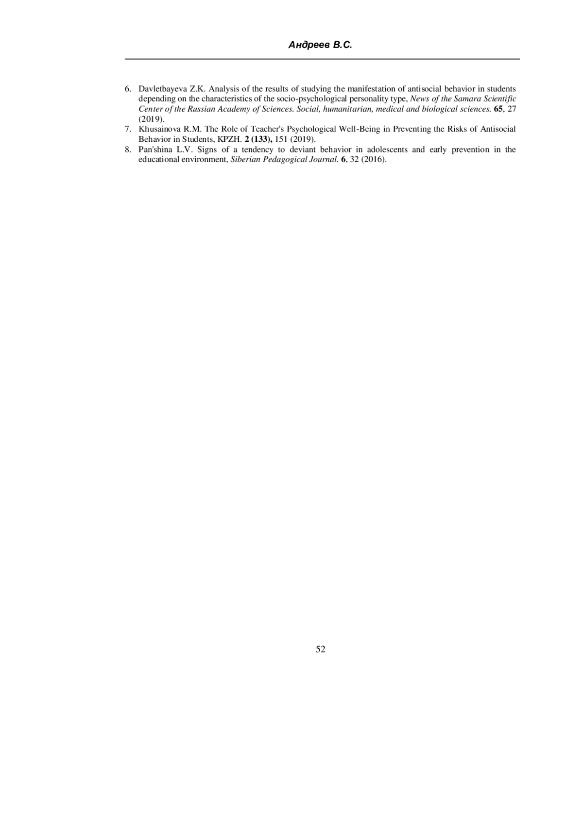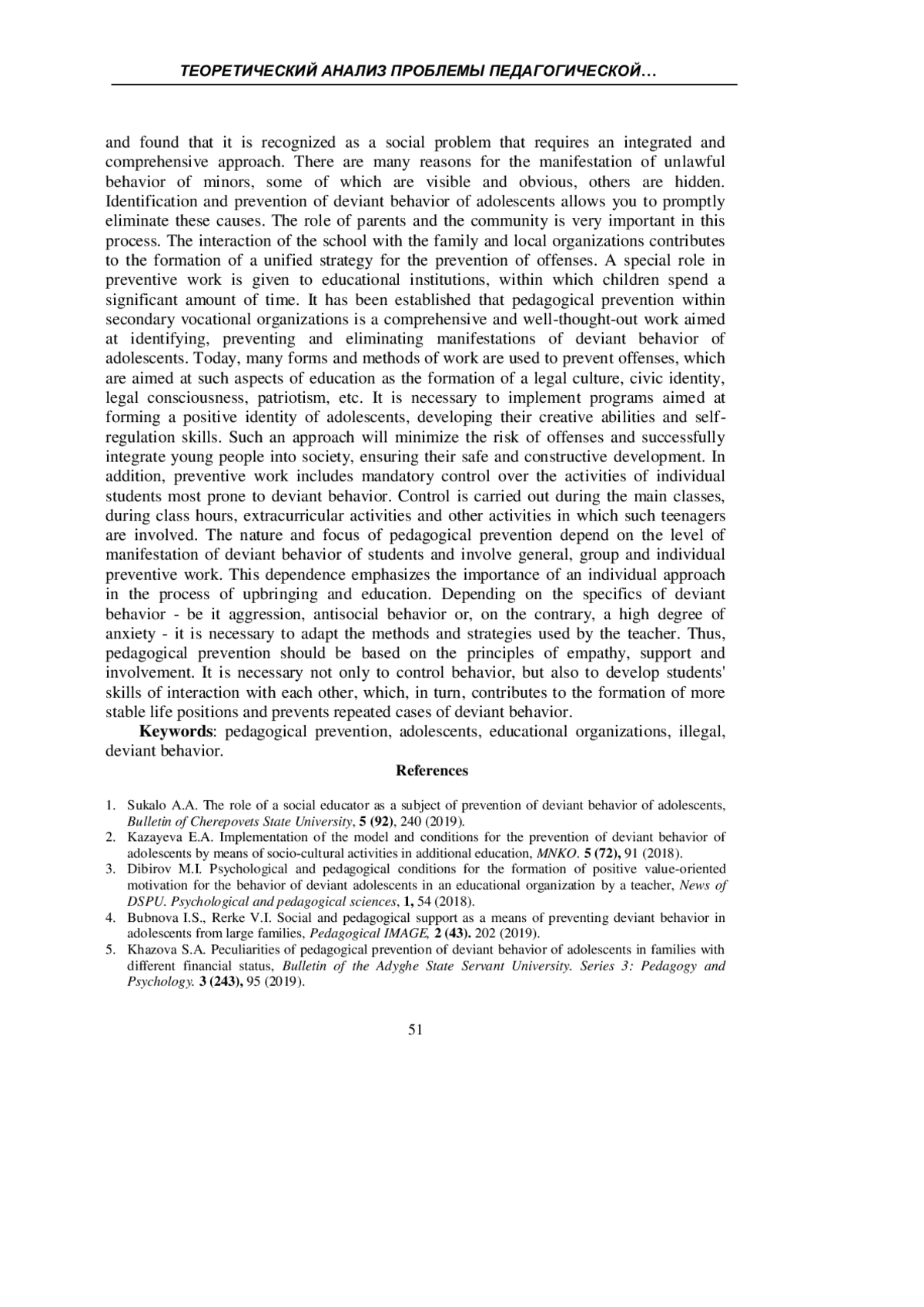 Настоящее исследование посвящено проблеме педагогической профилактики правонарушений у подростков, обучающихся в средних учебных заведениях. В исследовании выявлена сущность проблемы противоправного поведения несовершеннолетних и установлено, что оно признается социальной проблемой, требующей комплексного и всестороннего подхода. Существует множество причин проявления противоправного поведения несовершеннолетних, одни из которых являются видимыми и очевидными, другие - скрытыми. Выявление и профилактика девиантного поведения подростков, позволяет своевременно устранить указанные причины. Особая роль в профилактической работе отводится именно образовательным учреждениям, в рамках которых дети проводят значительное количество времени. Установлено, что педагогическая профилактика в рамках средних профессиональных организаций является комплексной и продуманной работой, направленной на выявление, предотвращение и устранение проявлений девиантного поведения подростков. На сегодняшний день применяется множество форм и методов работы с целью профилактики правонарушений, которые направлены на такие аспекты воспитания, как формирование правовой культуры, гражданской идентичности, правосознания, патриотизма и т. д. Кроме того, профилактическая работа включает в себя обязательный контроль за деятельностью отдельных студентов, наиболее склонных к проявлению девиантного поведения. Контроль осуществляется в процессе основных занятий, на классных часах, внеурочных мероприятиях и иной деятельности, в которой задействованы такие подростки. Характер и направленность педагогической профилактики зависят от уровня проявления девиантного поведения студентов и предполагают общую, групповую и индивидуальную профилактическую работу.