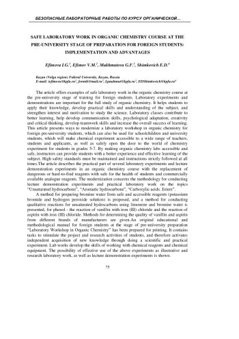 Разработаны простые в исполнении, короткие по времени, но эффектные демонстрационные эксперименты и лабораторные работы с применением безопасных химических реактивов по темам: «Непредельные углеводороды», «Ароматические углеводороды», «Карбоновые кислоты. Сложные эфиры». Статья описывает опыт практической реализации данных лабораторных работ по курсу органической химии на довузовском этапе подготовки иностранных учащихся. По результатам апробации подготовлено к печати оригинальное учебно-методическое пособие «Лабораторный практикум по органической химии» для иностранных учащихся на этапе довузовской подготовки. Полученные практические результаты позволяют сделать вывод о важности безопасных лабораторных работ на этапе довузовской подготовки иностранных учащихся и их положительном влиянии на успешное усвоение материала обучающимися.