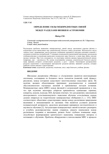 Рассмотрена проблема выявления межпредметных связей между школьными курсами физики и астрономии путем вычисления мер семантической близости между разделами. Используется метод «мешок слов»: сравниваемые тексты (разделы учебников) заменяются списками ключевых понятий с указанием количества употреблений. С помощью специальной компьютерной программы для разделов учебников физики и астрономии вычисляют косинусную меру близости, а также меру Дайса, находят среднее значение. При этом учитывается, что некоторые понятия связаны парадигматической связью (например, свет - светимость). На основе получившейся матрицы семантической близости рисуют граф, вершины которого соответствуют разделам, а дуги - связям. Анализируют распределение разделов астрономии в шестимерном пространстве разделов физики, выявляют разделы, которые наиболее сильно связаны с курсом физики.