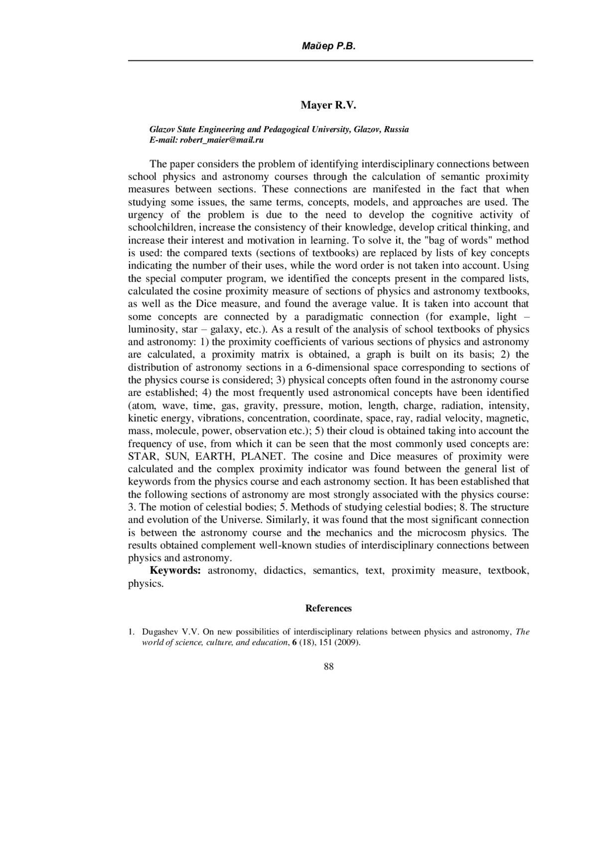 1. Дугашев В.В. О новых возможностях межпредметных связей физики и астрономии / В.В. Дугашев // Мир науки, культуры, образования. - 2009. - № 6 (18). - С. 151-154. EDN: KZZWDT