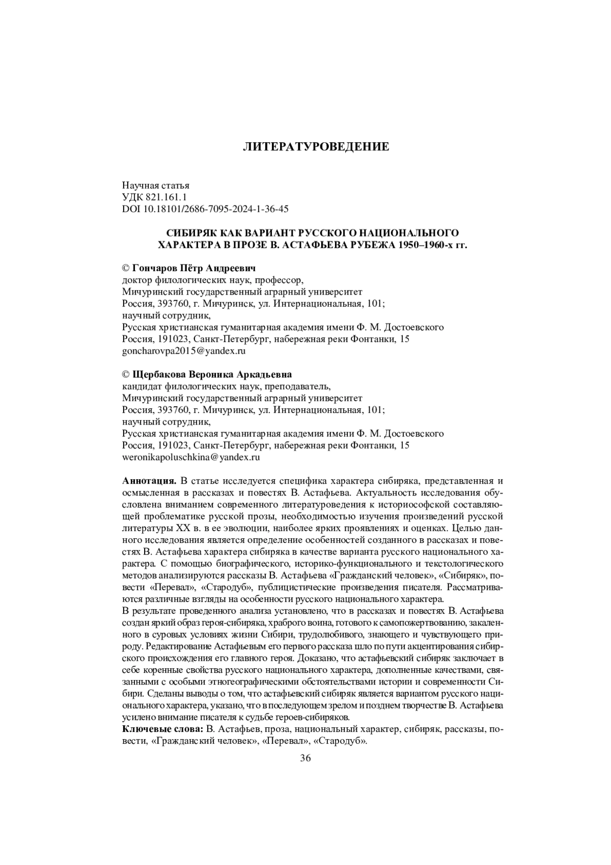 В статье исследуется специфика характера сибиряка, представленная и осмысленная в рассказах и повестях В. Астафьева. Актуальность исследования обусловлена вниманием современного литературоведения к историософской составляющей проблематике русской прозы, необходимостью изучения произведений русской литературы ХХ в. в ее эволюции, наиболее ярких проявлениях и оценках. Целью данного исследования является определение особенностей созданного в рассказах и повестях В. Астафьева характера сибиряка в качестве варианта русского национального характера. С помощью биографического, историко-функционального и текстологического методов анализируются рассказы В. Астафьева «Гражданский человек», «Сибиряк», повести «Перевал», «Стародуб», публицистические произведения писателя. Рассматриваются различные взгляды на особенности русского национального характера. В результате проведенного анализа установлено, что в рассказах и повестях В. Астафьева создан яркий образ героя-сибиряка, храброго воина, готового к самопожертвованию, закаленного в суровых условиях жизни Сибири, трудолюбивого, знающего и чувствующего природу. Редактирование Астафьевым его первого рассказа шло по пути акцентирования сибирского происхождения его главного героя. Доказано, что астафьевский сибиряк заключает в себе коренные свойства русского национального характера, дополненные качествами, связанными с особыми этногеографическими обстоятельствами истории и современности Сибири. Сделаны выводы о том, что астафьевский сибиряк является вариантом русского национального характера, указано, что в последующем зрелом и позднем творчестве В. Астафьева усилено внимание писателя к судьбе героев-сибиряков.