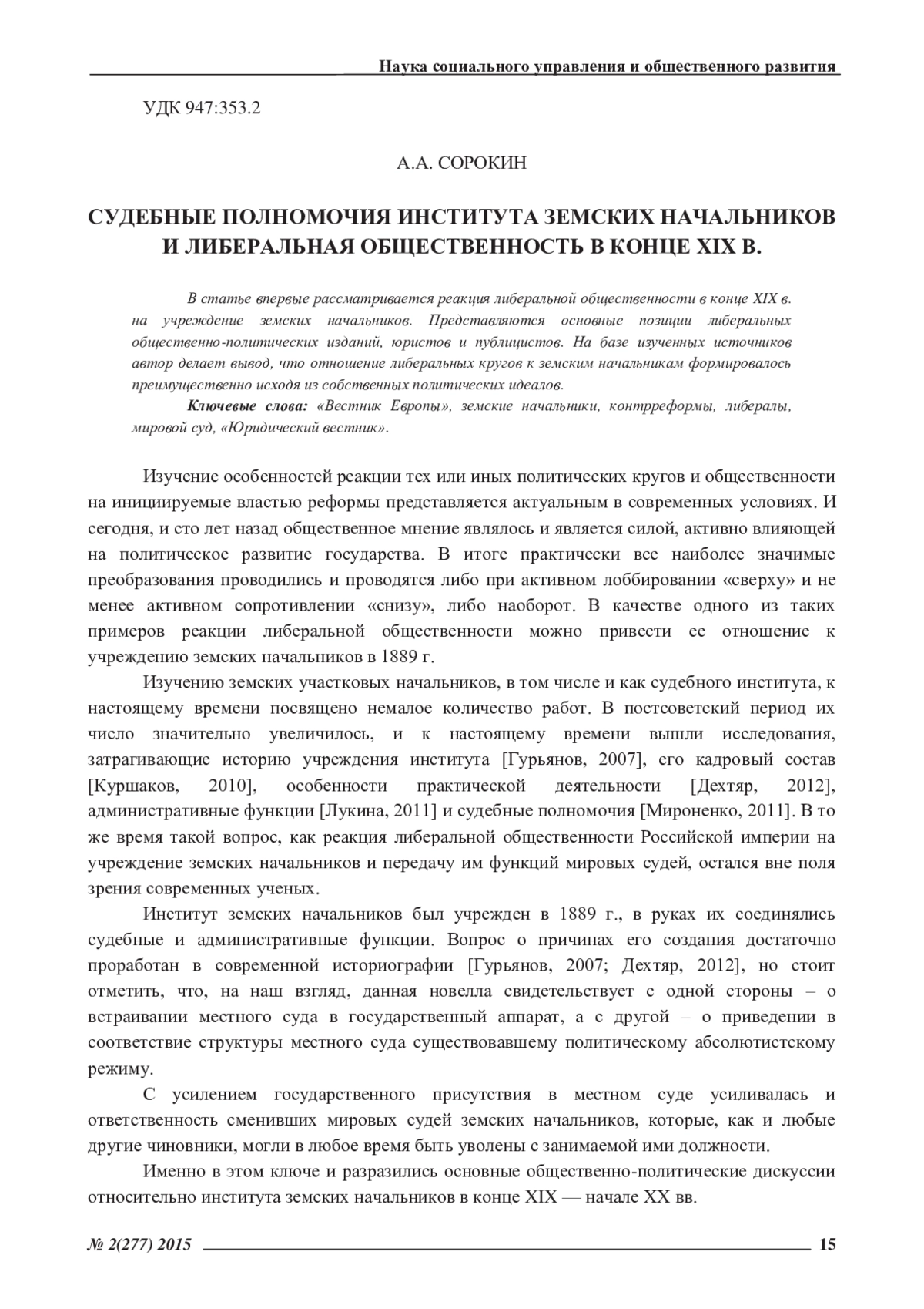В статье впервые рассматривается реакция либеральной общественности в конце XIX в. на учреждение земских начальников. Представляются основные позиции либеральных общественно-политических изданий, юристов и публицистов. На базе изученных источников автор делает вывод, что отношение либеральных кругов к земским начальникам формировалось преимущественно исходя из собственных политических идеалов
