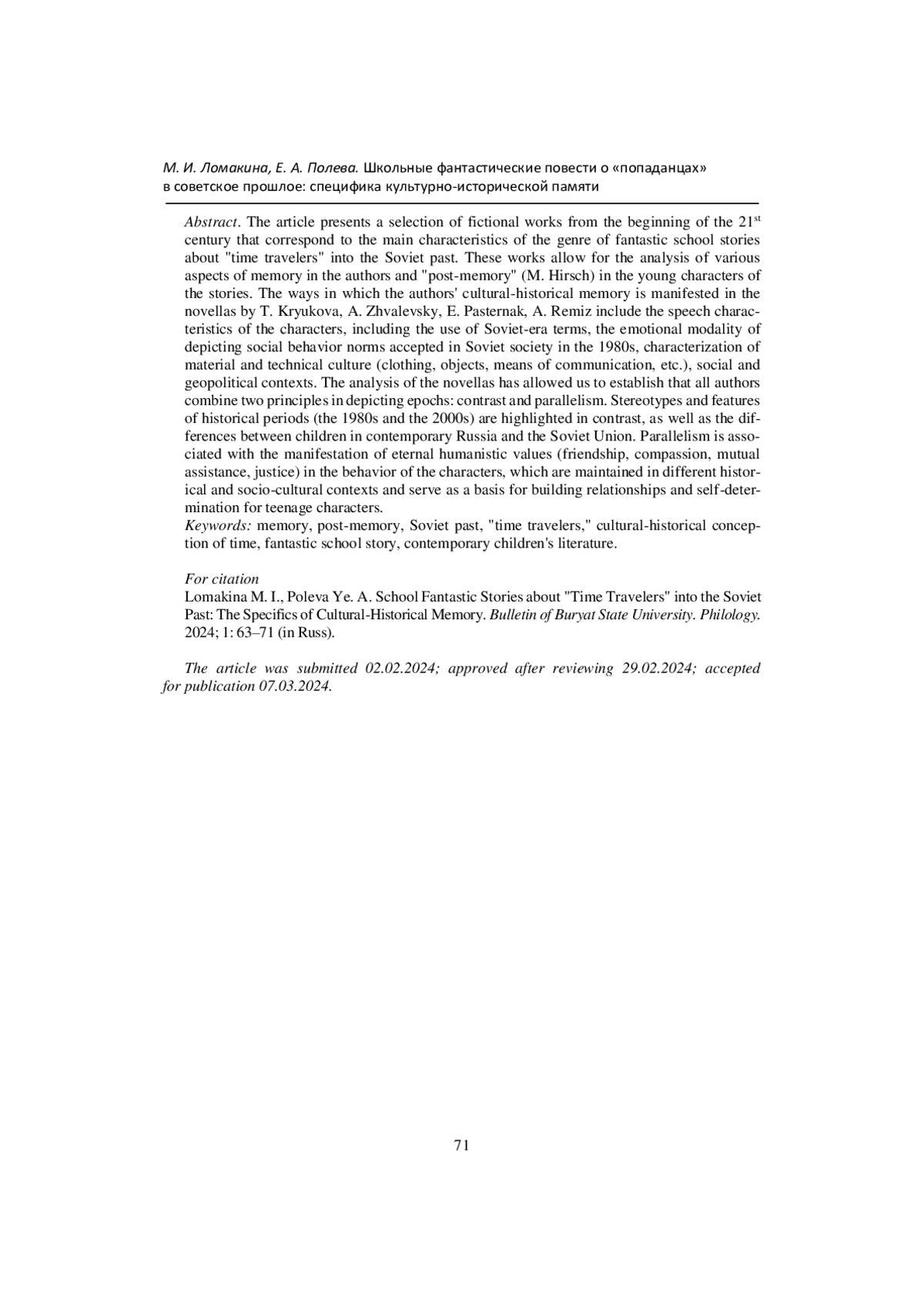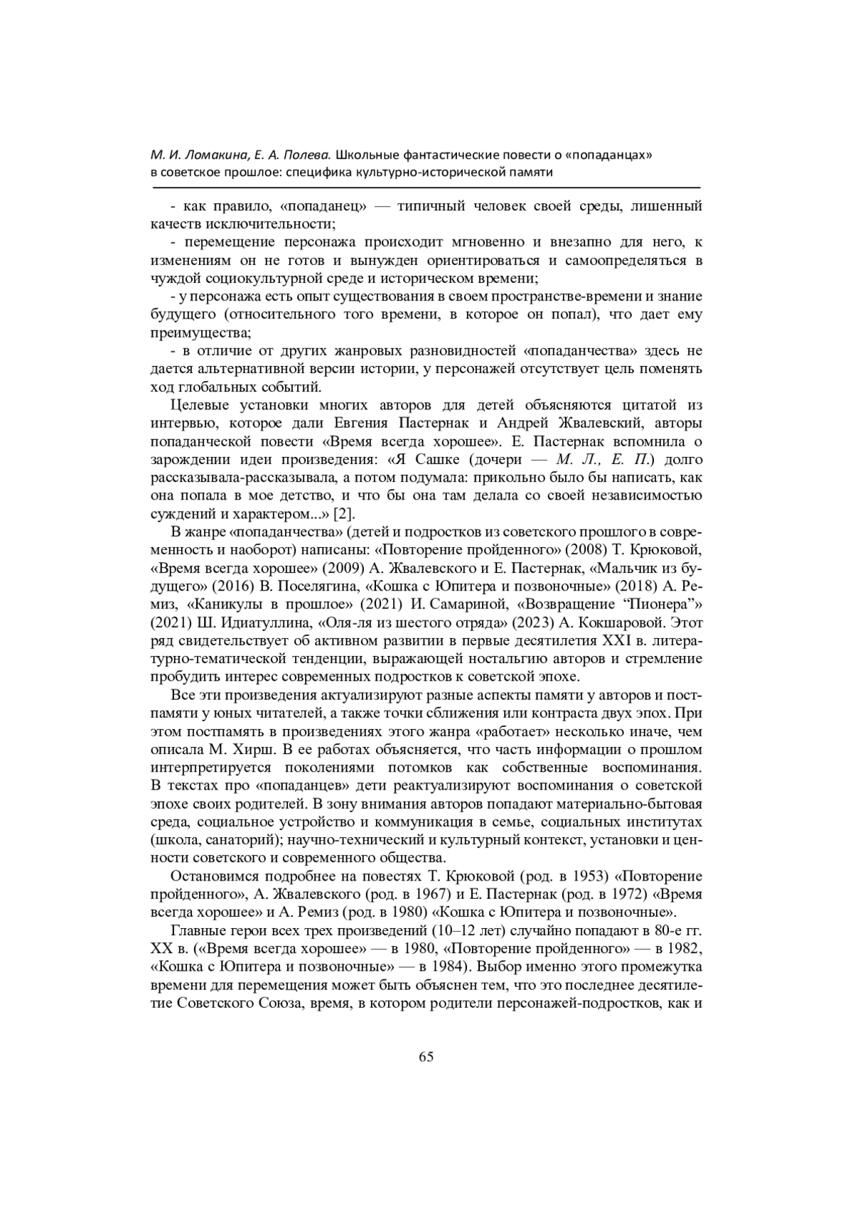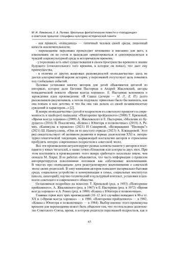 В статье представлена выборка художественных произведений начала ХХI в., соответствующих основным характеристикам жанра фантастической школьной повести о «попаданцах» в советское прошлое и позволяющих анализировать разные аспекты памяти у авторов и «постпамяти» (М. Хирш) у юных персонажей произведений. Способами проявления авторской культурно-исторической памяти в повестях Т. Крюковой, А. Жвалевского, Е. Пастернак, А. Ремиз являются речевые особенности персонажей, в том числе использование советизмов, эмоциональная модальность освещения социальных правил поведения, принятых в советском обществе 1980-х гг., характеристика материально-технической культуры (одежда, вещи, средства связи и пр.), социальных и геополитических контекстов. Анализ повестей позволил установить, что все авторы соединяют два принципа изображения эпох: контраст и параллелизм. На контрасте высвечиваются стереотипы и особенности исторических периодов (1980-х и 2000-х гг.), различие детей современной России и Советского Союза. Параллелизм же связан с проявлением в поведении персонажей вечных гуманистических ценностей (дружба, сострадание, взаимовыручка, справедливость), которые сохраняются в разных исторических и социокультурных контекстах и составляют опору для выстраивания отношений и самоопределения персонажей-подростков.