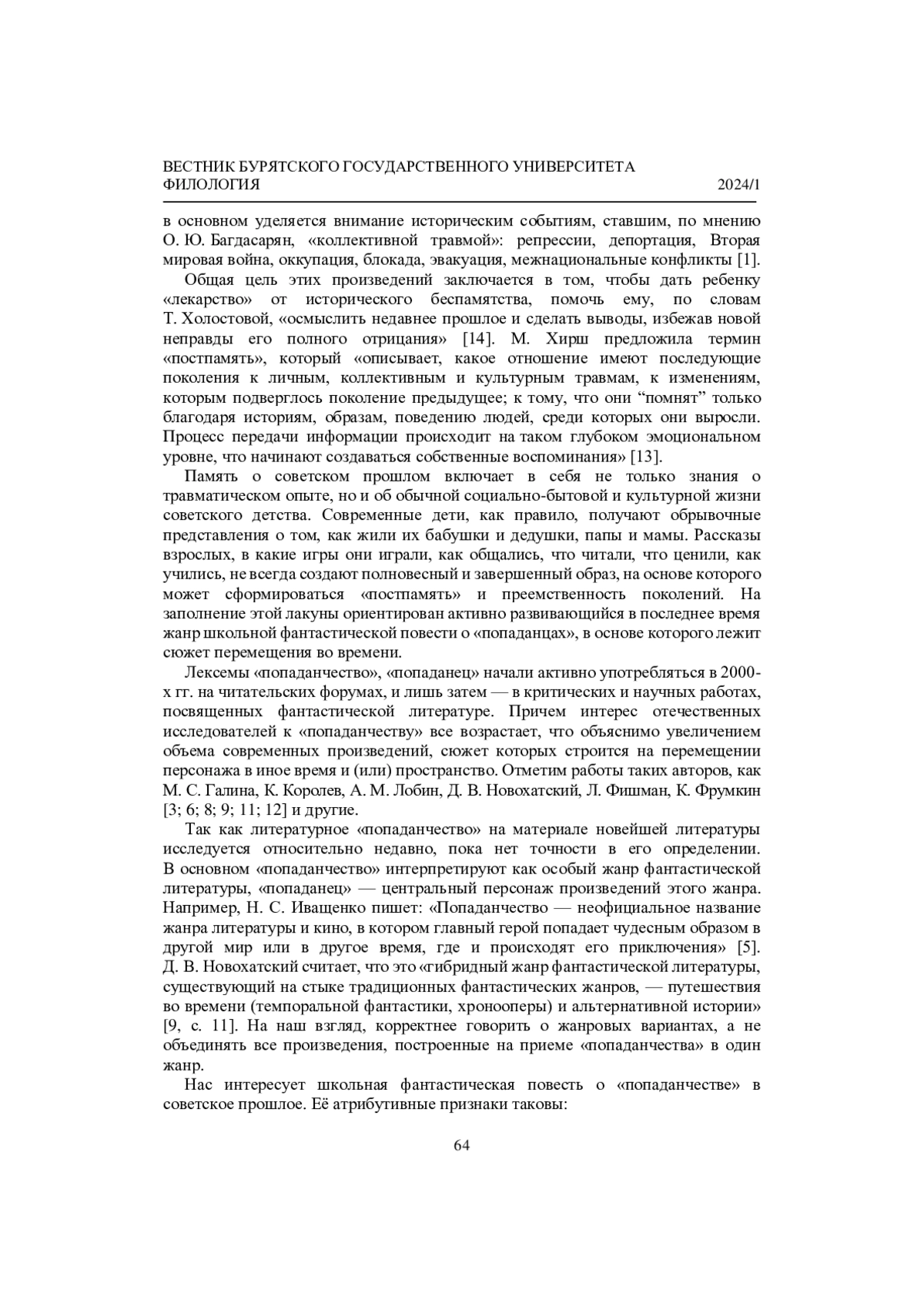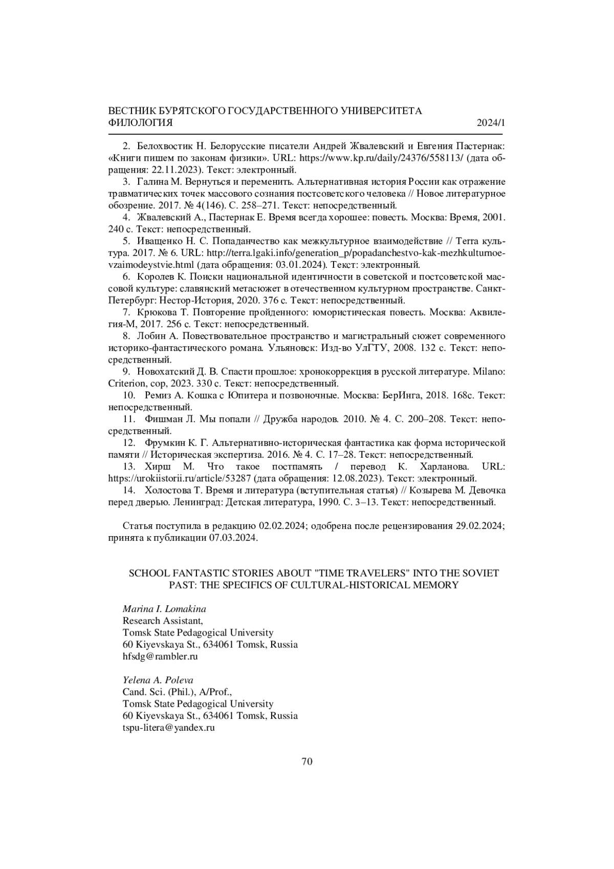 1. Багдасарян О. Ю. Память второго поколения и работа с прошлым в современной детской литературе // Политическая лингвистика. 2019. № 6(78). С. 132-138. Текст: непосредственный. EDN: LEDXJL