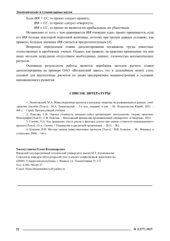 ХИСАМУТДИНОВА Е. В. ОБОСНОВАНИЕ ВЕЛИЧИНЫ СТАВКИ ДИСКОНТИРОВАНИЯ ДЛЯ ОЦЕНКИ ИННОВАЦИОННЫХ ПРОЕКТОВ В МАШИНОСТРОЕНИИ // ЭКОНОМИЧЕСКИЕ И ГУМАНИТАРНЫЕ НАУКИ. 2015. № 2 (277)