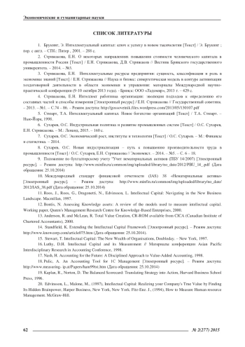 3. Стрижакова, Е.Н. Интеллектуальные ресурсы предприятия: сущность, классификация и роль в экономике знаний [Текст] / Е.Н. Стрижакова // Наука и бизнес: синергетическая модель в контуре активизации хоздоговорной деятельности в области экономики и управления: материалы Международной научно- практической конференции (9-10 октября 2013 года). - Брянск: ООО «Ладомир», 2013 г. - 429 с. EDN: TLSZBP