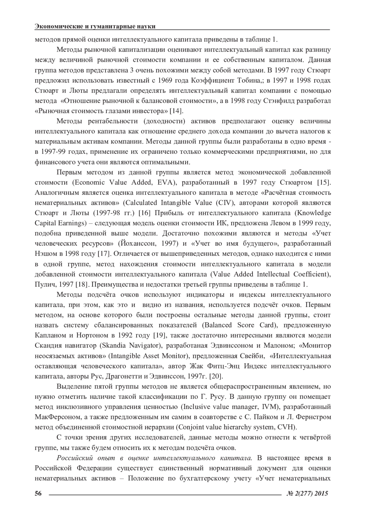 В настоящее время отдача от человеческого капитала превосходит отдачу от физического, однако существующие теории не могут учесть в полной мере величину нематериальных ресурсов, в особенности интеллектуальный капитал. Методики определения интеллектуального капитала являются достаточно востребованными, и правильный выбор оптимального из них может повысить эффективность управления данными ресурсами