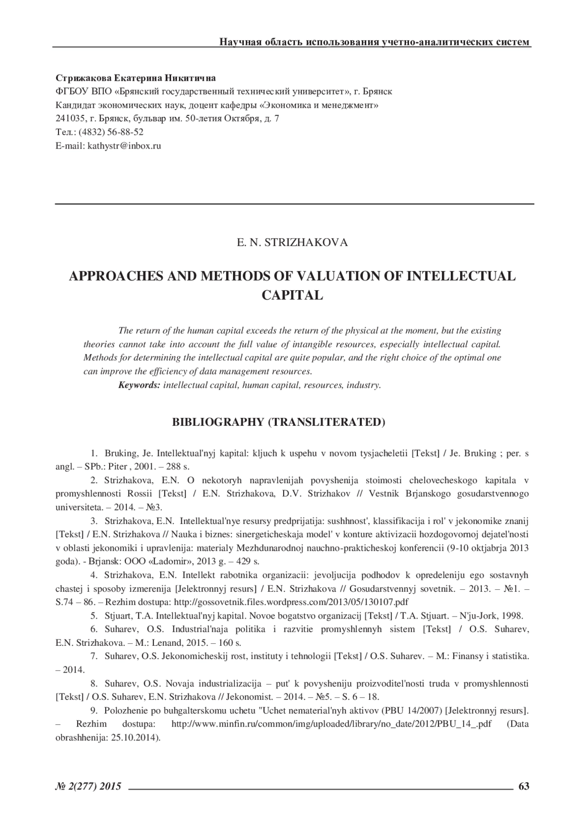 2. Стрижакова, Е.Н. О некоторых направлениях повышения стоимости человеческого капитала в промышленности России [Текст] / Е.Н. Стрижакова, Д.В. Стрижаков // Вестник Брянского государственного университета. - 2014. - №3. EDN: TMERYN