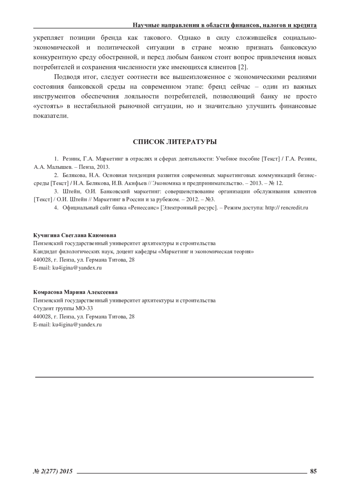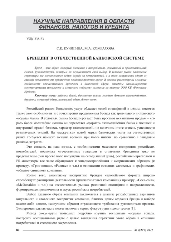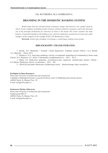 КУЧИГИНА С. К., КОМРАСОВА М. А. БРЕНДИНГ В ОТЕЧЕСТВЕННОЙ БАНКОВСКОЙ СИСТЕМЕ // ЭКОНОМИЧЕСКИЕ И ГУМАНИТАРНЫЕ НАУКИ. 2015. № 2 (277)