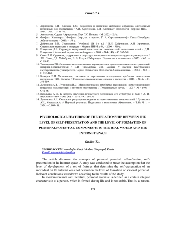 В статье рассмотрены понятия личностный потенциал, саморефлексия, самопрезентация в интернет пространстве. Проанализирована современная и классическая литература по изучению понятия личностного потенциала и его компонентов. Проведено исследование с целью доказать предположение о том, что уровень развития совокупности признаков, определяющих самопрезентацию личности в интернете не зависит от уровня сформированности личностного потенциала. Выявили, что проявление личностного потенциала в интернет пространстве имеет ряд особенностей, связанных с его компонентами, что и в реальной жизни. В конце приведены актуальные выводы согласно результатам исследования.
