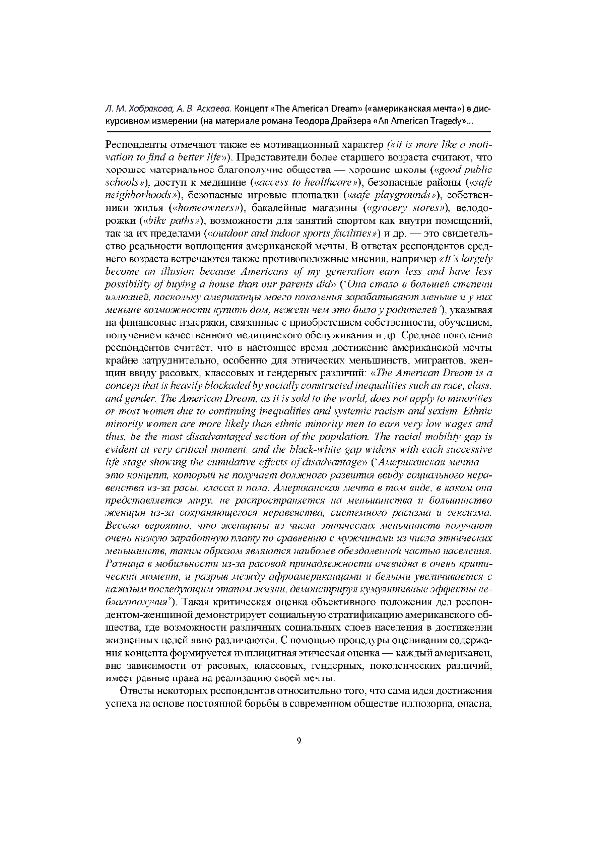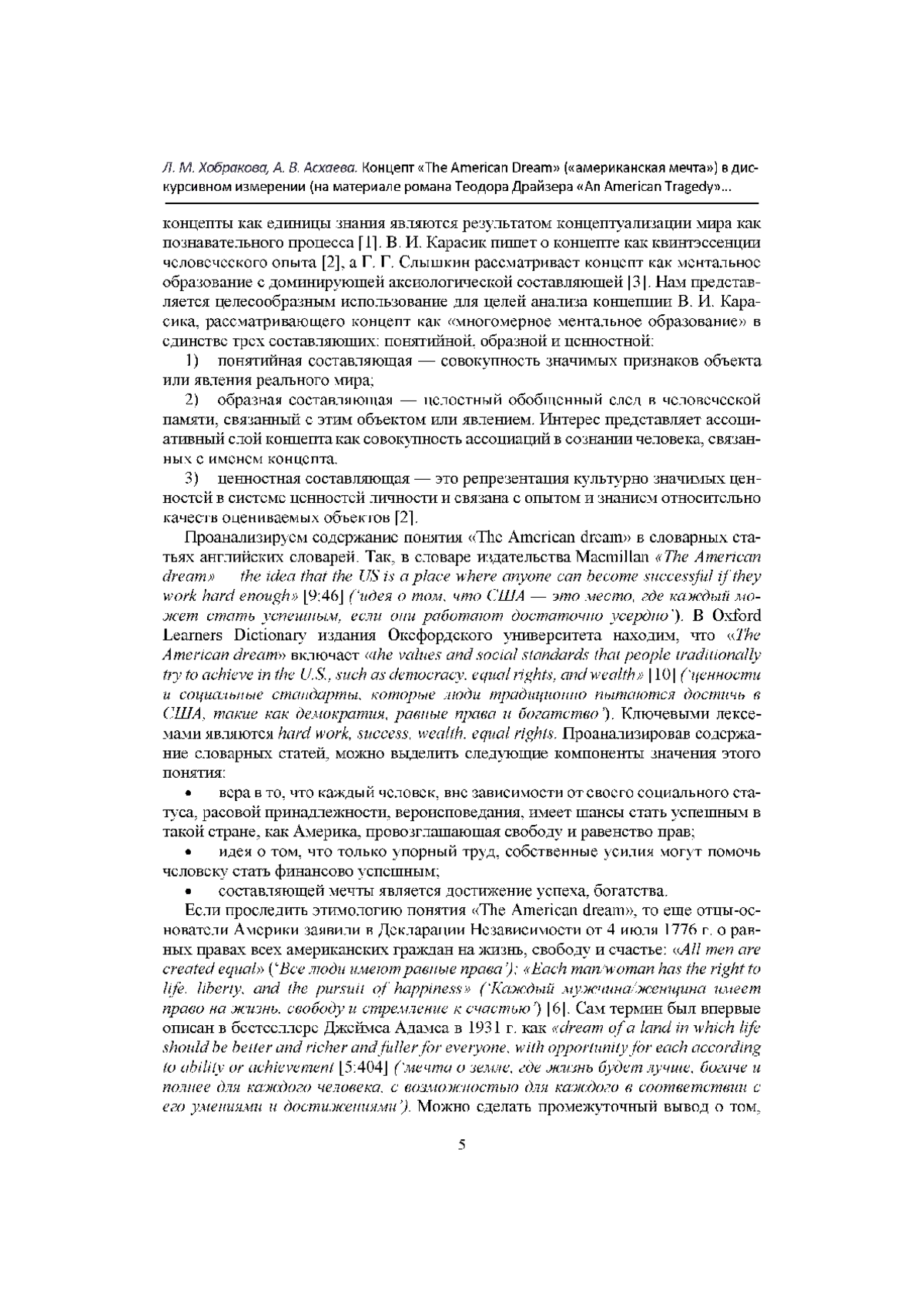 Статья представляет собой опыт дискурсивной интерпретации концепта «The American dream» на материале романа выдающегося писателя Теодора Драйзера «An American tragedy», в котором отражена иллюзорность мечтаний в поисках лучшей жизни в американском обществе первой половины XX века, а также представлений современных американцев. Основная цель работы - понять специфику объективации этого концепта. Актуальный характер исследования определяется значимостью достижения жизненных целей и успеха в современном прагматичном обществе. Основной интерпретативный метод на основе дискурсивного анализа, а также диагностический метод (опрос) используются для анализа концепта. Авторы описывают данный концепт в единстве его понятийной, образной и ценностной составляющих, анализируют его содержательное наполнение в романе, а также в текстах персонального дискурса на основе опроса американских граждан. В работе обращается внимание на неоднозначность трактовок современными американцами этого концепта ввиду объективных реалий меняющегося мира. Авторы приходят к выводу о том, что рассматриваемый концепт - сугубо национальный феномен, отражающий менталитет, культурно-специфические особенности американцев.