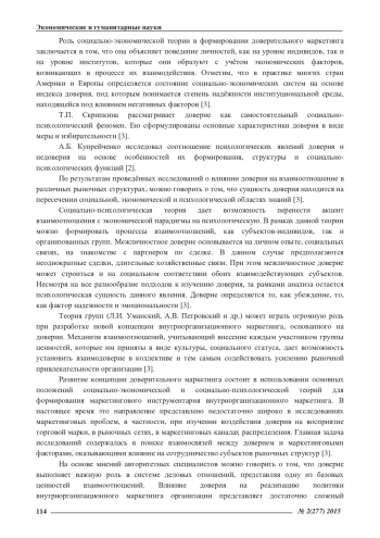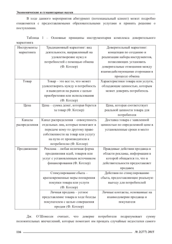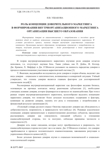 Формирование доверия во взаимоотношениях с потребителями в последнее время является одной из наиболее актуальных концепций внутриорганизационного маркетинга. В условиях российского кризиса, значение доверия выступает существенным социальным капиталом. Организации высшего образования, построившие отношения с потребителями на доверии, получают реальное преимущество – более разнообразный и более современный менеджмент
