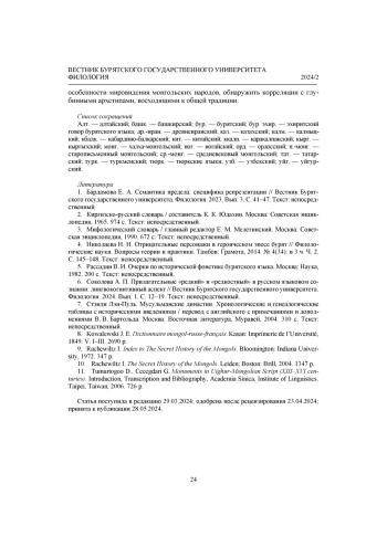 5. Рассадин В. И. Очерки по исторической фонетике бурятского языка. Москва: Наука, 1982. 200 с. Текст: непосредственный. EDN: VTBMJR