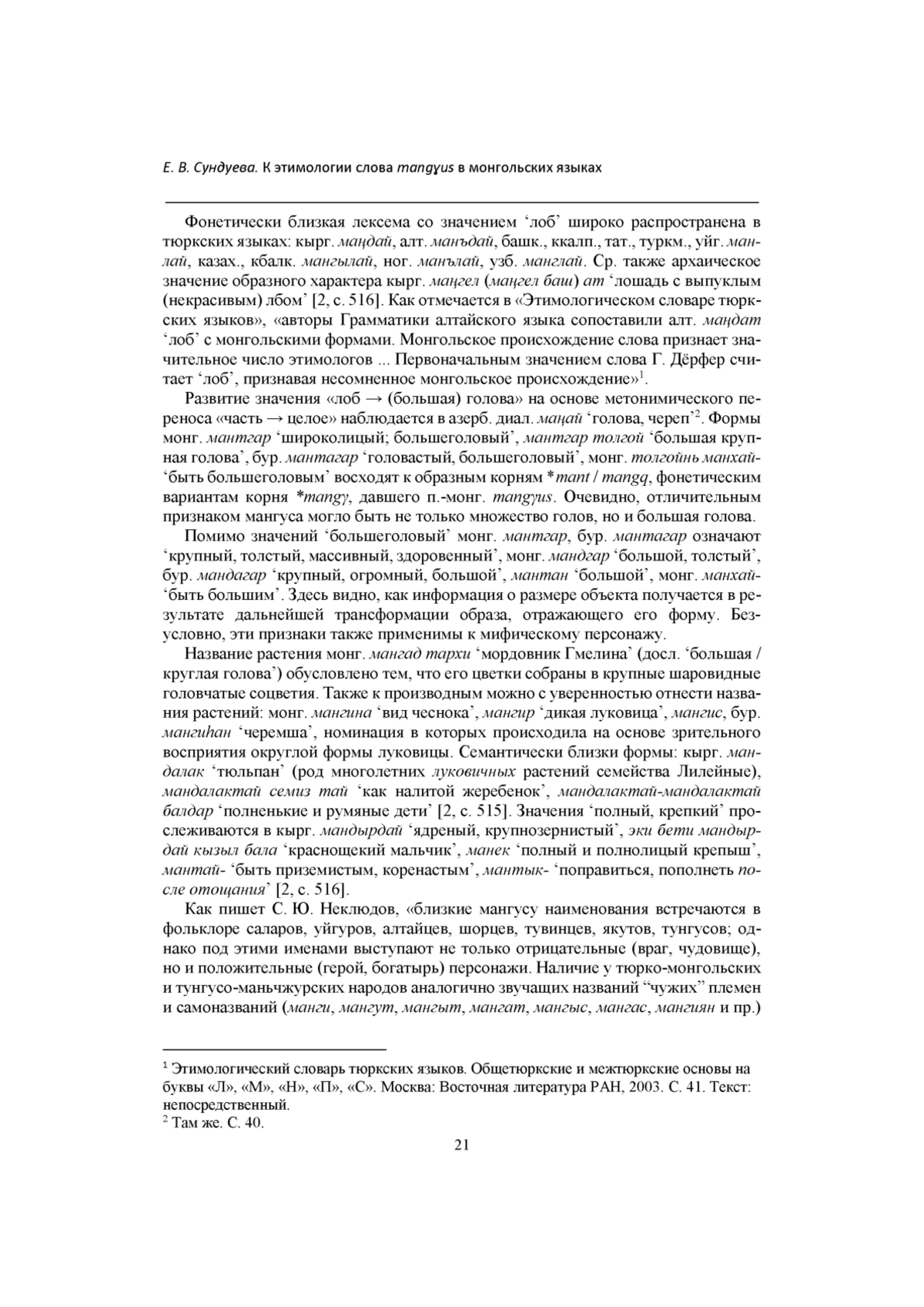В данной работе предпринята попытка выявить внутреннюю форму слова mangyus, обозначающего основного отрицательного персонажа из фольклора монгольских народов в виде многоголового антропоморфного существа, противопоставляемого положительным эпическим героям. Использованы материалы лексикографических и фольклорных источников, также для сравнения привлекаются данные тюркских языков. На основе анализа семантики слов с корнем *mang (и его вариантов *mangq, *mant, *mand) автор устанавливает, что данный корень служил для реализации признаков ‘округлый’ → ‘большеголовый’ → ‘многоголовый’. Эти признаки в полной мере применимы к внешнему виду рассматриваемых фольклорных персонажей. Автор предполагает, что именно образная лексика является ключом к выявлению мотива номинации базовой лексики алтайских языков. Выявление общего для монгольских и тюркских языков мотива номинации ‘большеголовый’ отражает особенности национально -культурного мировидения родственных народов.