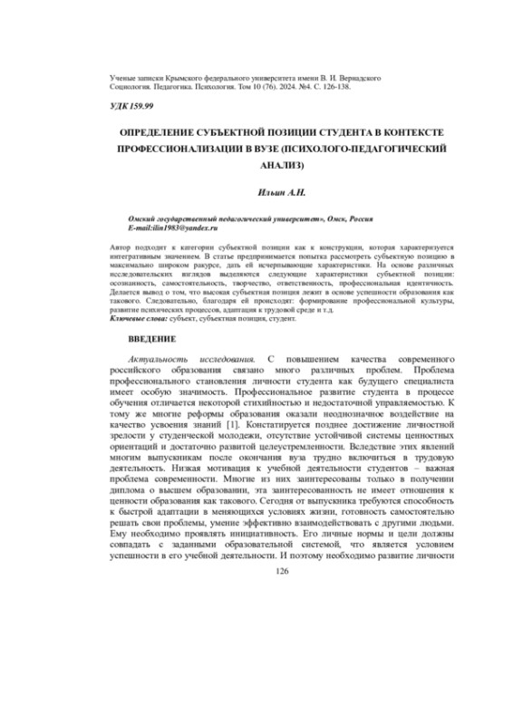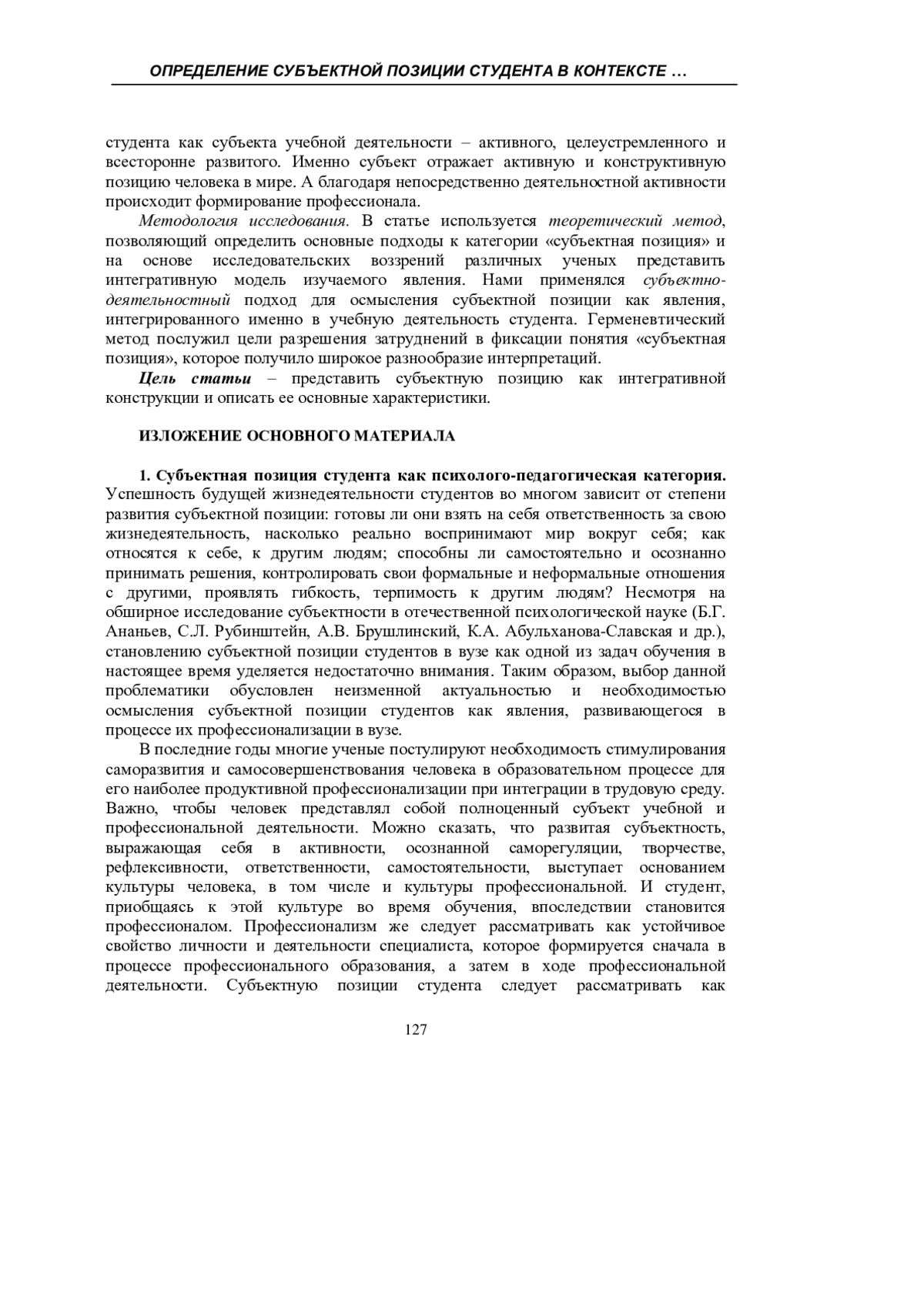 Автор подходит к категории субъектной позиции как к конструкции, которая характеризуется интегративным значением. В статье предпринимается попытка рассмотреть субъектную позицию в максимально широком ракурсе, дать ей исчерпывающие характеристики. На основе различных исследовательских взглядов выделяются следующие характеристики субъектной позиции: осознанность, самостоятельность, творчество, ответственность, профессиональная идентичность. Делается вывод о том, что высокая субъектная позиция лежит в основе успешности образования как такового. Следовательно, благодаря ей происходят: формирование профессиональной культуры, развитие психических процессов, адаптация к трудовой среде и т. д.