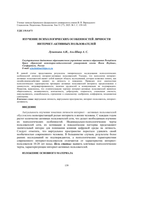 В данной статье представлены результаты эмпирического исследования психологических особенностей личности интернет-активных пользователей. Указано, что психология интернет-активных пользователей являет собой важную область исследований, которая позволяет понять, как онлайн-взаимодействия влияют на личность и поведение. Приведен итог диагностики психологических характеристик чрезмерно активных пользователей интернета: предположение о замкнутости, интровертированности, наличии трудностей в коммуникации не подтверждено. Напротив, выяснилось, что отличительными чертами интернет-активных пользователей являются: общительность, независимость, контактность, добродушие, открытость, социальная смелость, импульсивность, социабельность, стремление к социальному одобрению, конформизм, неадекватная самооценка.