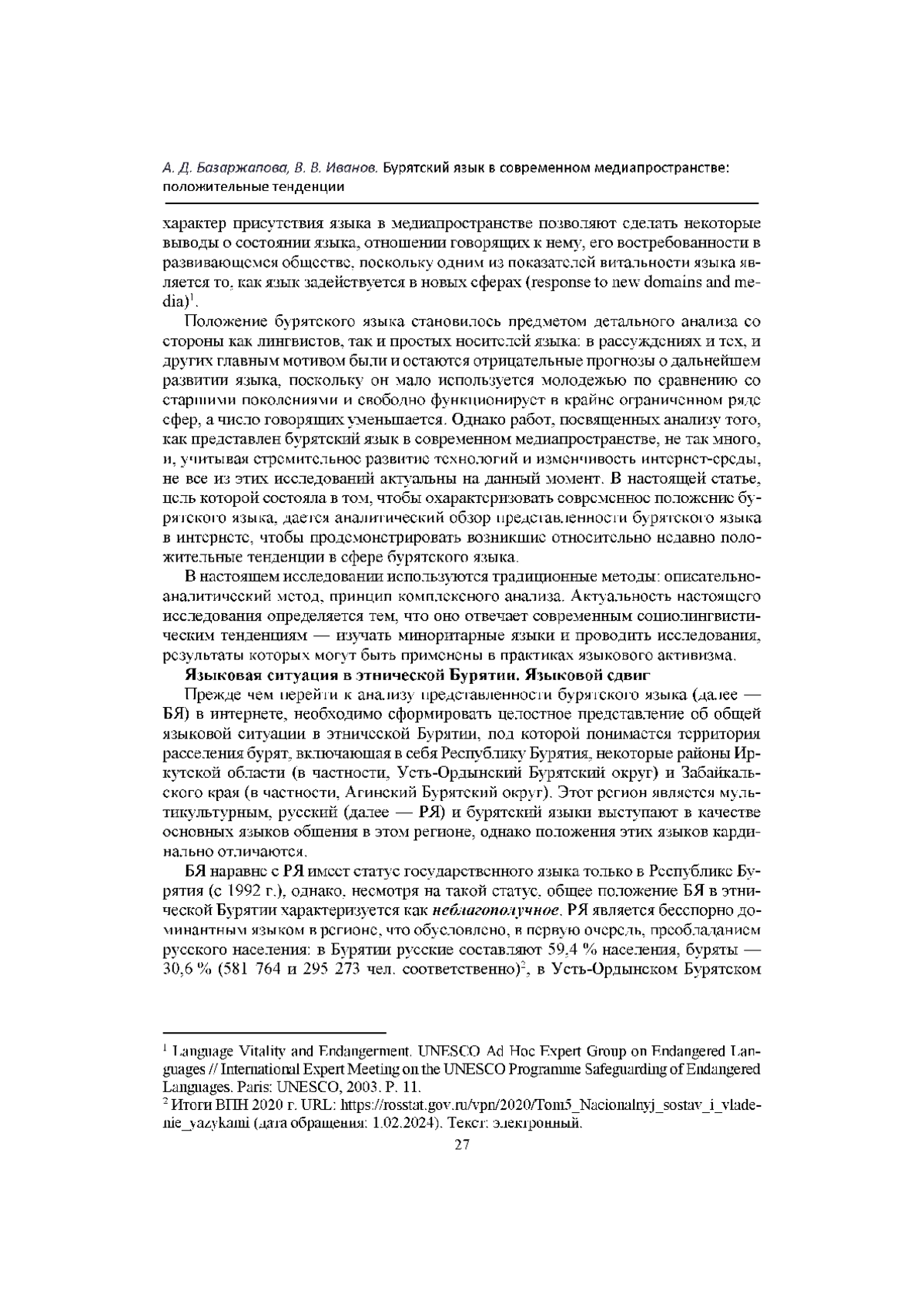 3. Дырхеева Г. А. Живая речь в Бурятии: к проблеме изучения (социолингвистический обзор) // Вестник Томского государственного университета. Филология. 2017. № 45. С. 77-88. Текст: непосредственный. EDN: XXQLRT