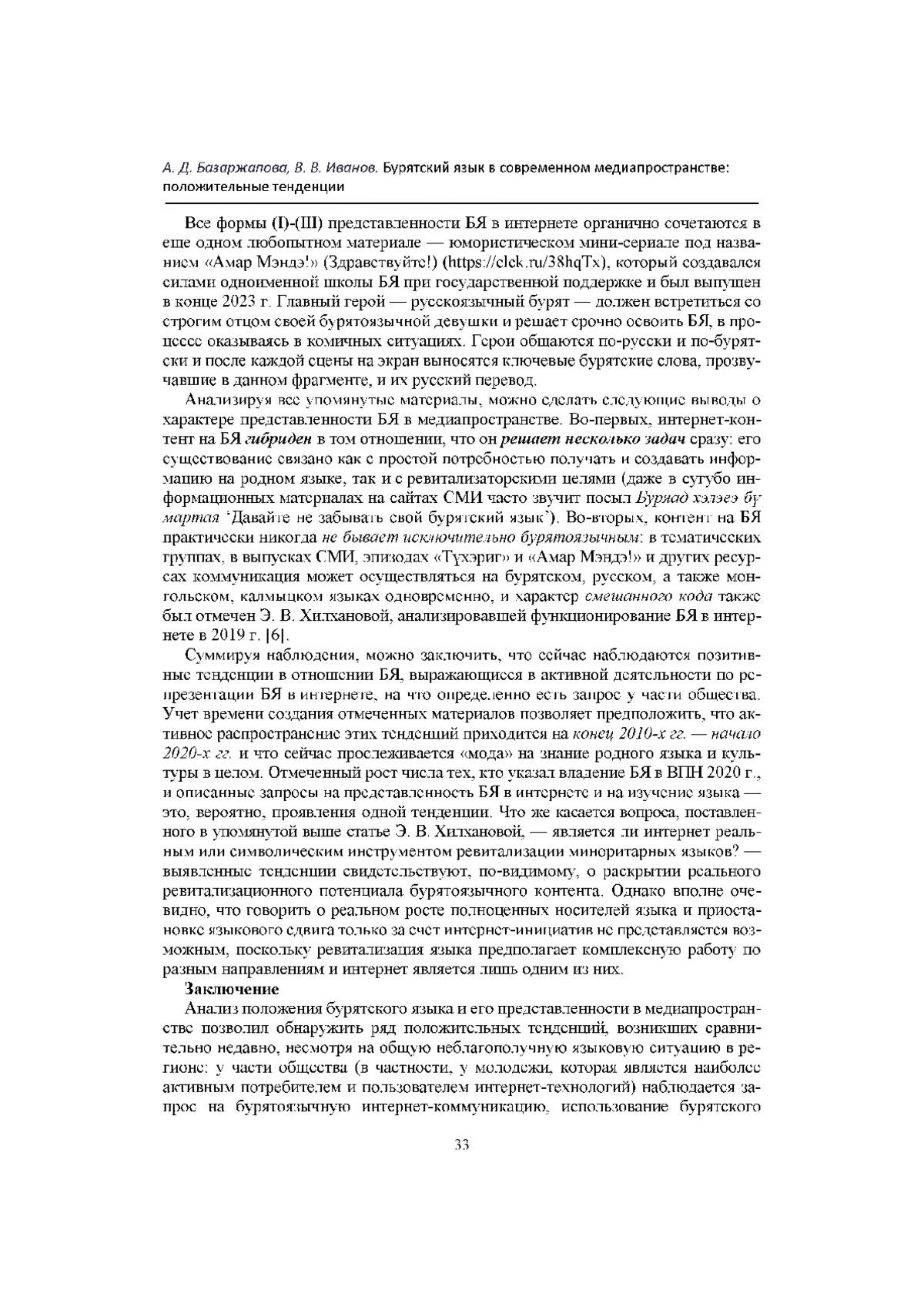 4. Иванов В. В., Харитонов В. С. Бурятский язык // Итоговые документы Научного центра по сохранению, возрождению и документации языков России / ИЯ РАН. 2021. С. 137-142. URL: https://iling-ran.ru/languages_of_russia/2021_stage1/doc2.pdf (дата обращения: 31.01.2024). Текст: электронный.