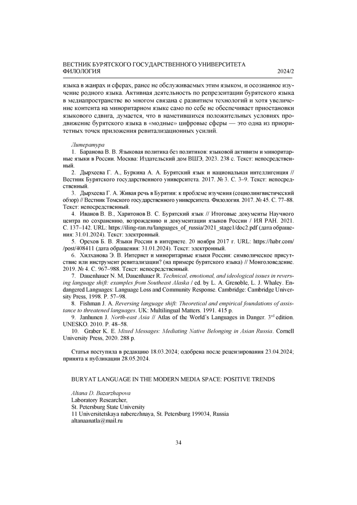 6. Хилханова Э. В. Интернет и миноритарные языки России: символическое присутствие или инструмент ревитализации? (на примере бурятского языка) // Монголоведение. 2019. № 4. С. 967-988. Текст: непосредственный. EDN: QFLCZU