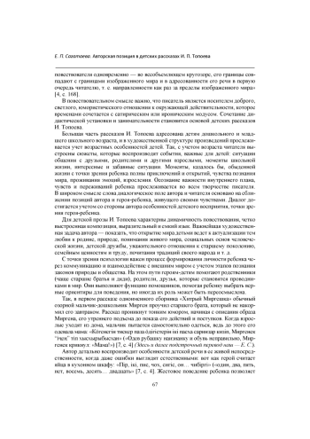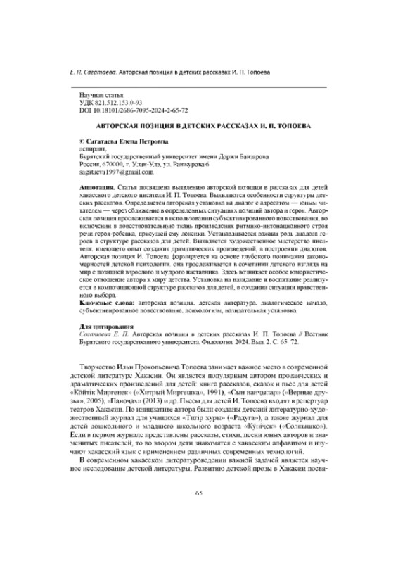 Статья посвящена выявлению авторской позиции в рассказах для детей хакасского детского писателя И. П. Топоева. Выявляются особенности структуры детских рассказов. Определяется авторская установка на диалог с адресатом - юным читателем - через сближение в определенных ситуациях позиций автора и героя. Авторская позиция прослеживается в использовании субъективированного повествования, во включении в повествовательную ткань произведения ритмико-интонационного строя речи героя-ребенка, присущей ему лексики. Устанавливается важная роль диалога героев в структуре рассказов для детей. Выявляется художественное мастерство писателя, имеющего опыт создания драматических произведений, в построении диалогов. Авторская позиция И. Топоева формируется на основе глубокого понимания закономерностей детской психологии, она прослеживается в сочетании детского взгляда на мир с позицией взрослого и мудрого наставника. Здесь возникает особое юмористическое отношение автора к миру детства. Установка на назидание и воспитание реализуется в композиционной структуре рассказов для детей, в создании ситуации нравственного выбора.