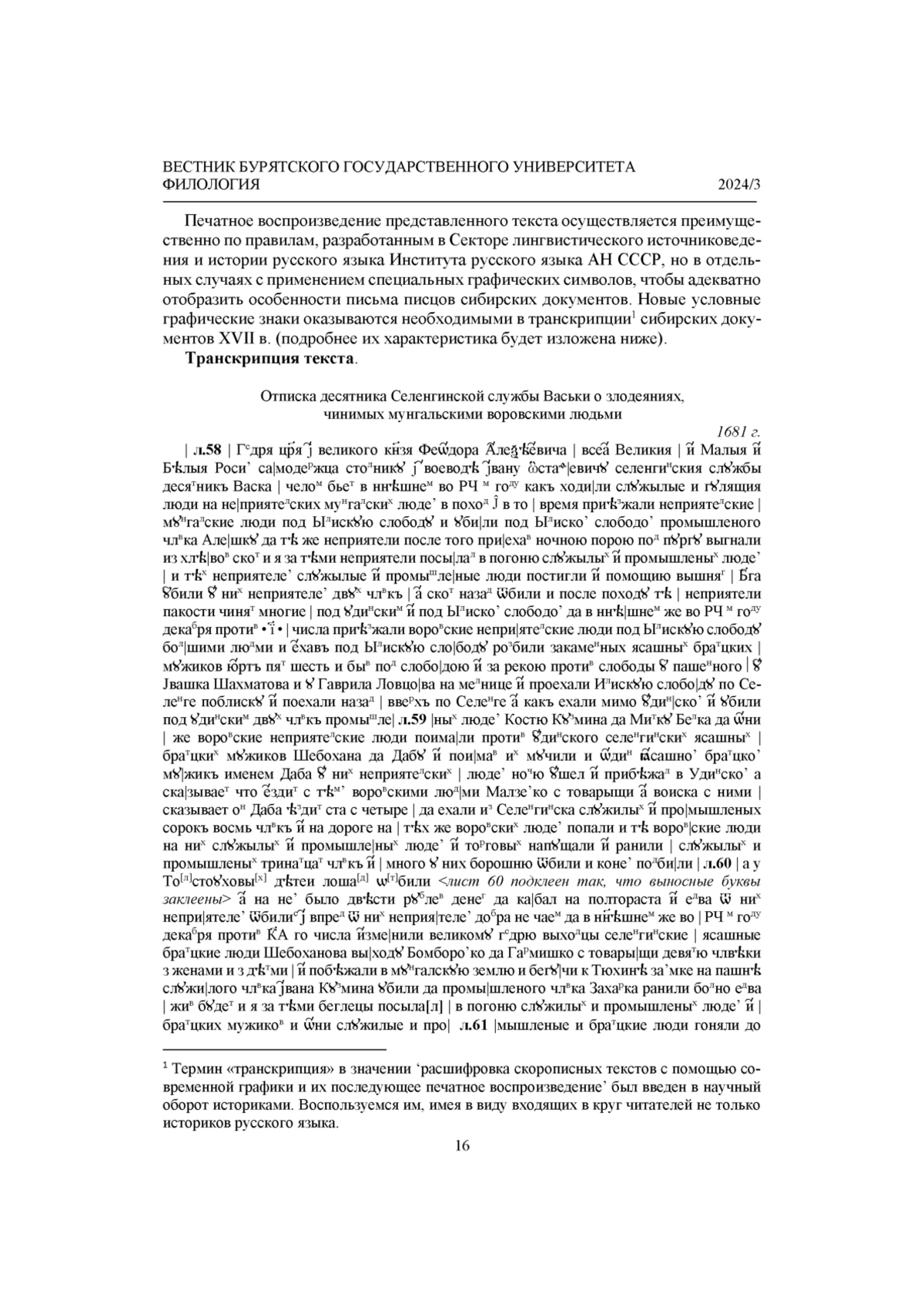 Статья посвящена графико-орфографическому описанию оригинальных сибирских документов XVII в. на материале текста «Отписка десятника Селенгинской службы Васьки о злодеяниях, чинимых мунгальскими воровскими людьми» (1682 г.), созданного на территории Забайкалья. Данный деловой текст представляет собой типичный рукописный документ регионального делопроизводства XVII в., его палеографические черты характерны для деловых бумаг этого периода - отсутствие пробела между служебными и знаменательными словами, использование для датировки буквенной цифири, наличие выносных букв, сокращение сакральных и часто употребляемых слов с помощью титла, наличие дублетных букв в одном слове, многообразие начертаний одних и тех же букв, наличие диакритических знаков, которые зачастую отражают декоративную функцию. Анализ графики и орфографии позволил сделать следующие выводы: документ создан по графико-орфографическим правилам русской скорописи XVII в.; писец строго соблюдает орфографические нормы делового письма XVII в. Точно передаются написания, подчиняющиеся фонетическому принципу правописания, который выработался в приказном узусе на протяжении двух столетий.