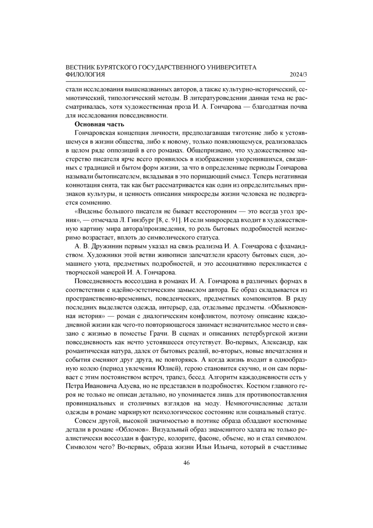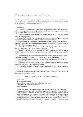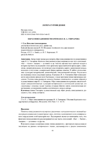 Автор ставит целью рассмотреть образ повседневности в художественном мире И. А. Гончарова. Феномен повседневности рассматривается как часть оппозиций: «быт - бытие», «вещное - духовное» и др. Анализу предшествует краткий экскурс в историю научного исследования этого феномена представителями философии, социологии, литературоведения, что позволяет констатировать широту диапазона различных подходов и отсутствие универсальной формулировки понятия. В работе использовались культурно-исторический, семиотический, типологический методы. Результатом исследования стали следующие выводы. В романах И. А. Гончарова образ повседневности представлен прежде всего бытовыми, а также пространственно-временными реалиями. Поэтика повседневности является базовым компонентом создания образов в художественном мире И. А. Гончарова. Образ повседневности в романах писателя обладает самодостаточностью, культурно-исторической и эстетической ценностью, его структурные элементы служат задачам создания образов героев, психологизации повествования, установлению идейно-эстетического замысла автора.