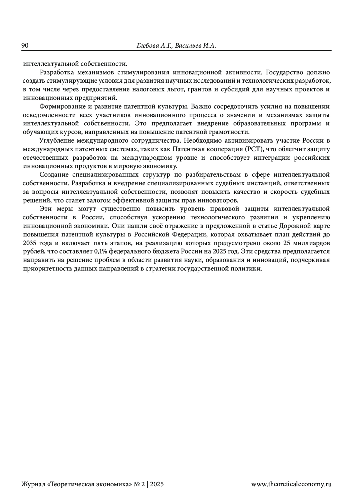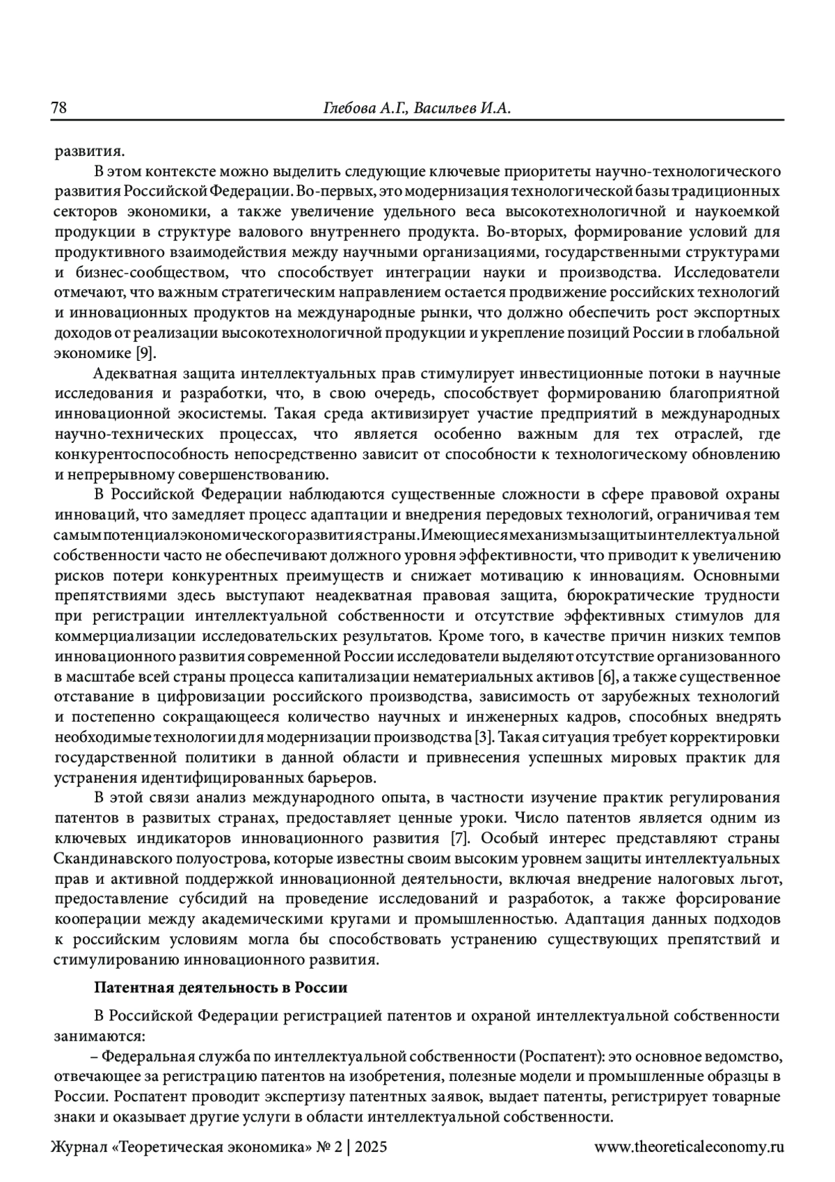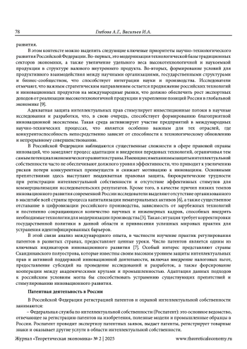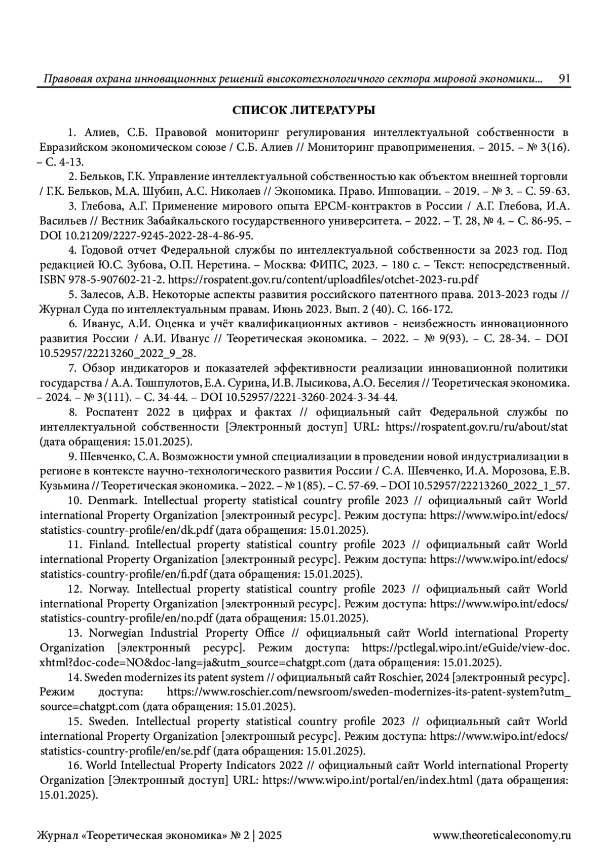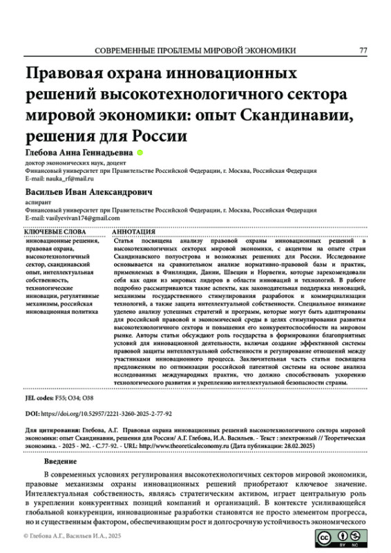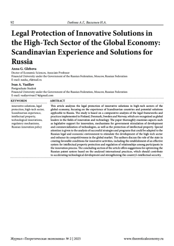 ГЛЕБОВА А. Г., ВАСИЛЬЕВ И. А. ПРАВОВАЯ ОХРАНА ИННОВАЦИОННЫХ РЕШЕНИЙ ВЫСОКОТЕХНОЛОГИЧНОГО СЕКТОРА МИРОВОЙ ЭКОНОМИКИ: ОПЫТ СКАНДИНАВИИ, РЕШЕНИЯ ДЛЯ РОССИИ // ТЕОРЕТИЧЕСКАЯ ЭКОНОМИКА. 2025. № 2 (122)