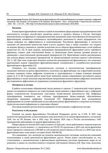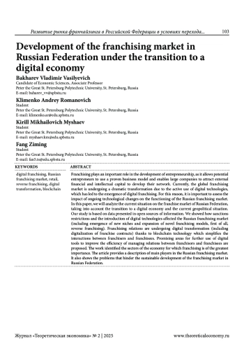 Франчайзинг играет важную роль в развитии предпринимательской деятельности, поскольку он позволяет начинающим бизнесменам использовать проверенную бизнес-модель и дает возможность крупным компаниям привлекать внешние финансовый и интеллектуальный капитал для формирования своей сети. В настоящее время мировой рынок франчайзинга трансформируется благодаря активному использованию цифровых технологий, что привело к возникновению цифрового франчайзинга. По этой причине большой интерес представляет оценка влияния происходящих технологических изменений на функционирование российского рынка франчайзинга. В данной работе нами был выполнен анализ современного рынка франшиз Российской Федерации с учетом перехода к цифровой экономике и текущей геополитической ситуации. При выполнении исследования нами были использованы данные, представленные в открытых источниках информации. Нами было показано, как санкционные ограничения и внедрение цифровых технологий повлияли на российский рынок франчайзинга (в т. ч. и путем создания новых ниш, а также расширения использования инновационных моделей франчайзинга, прежде всего, обратного франчайзинга). Реализуется дальнейшая цифровая трансформация франчайзинговых отношений (включая перевод в цифровой формат сделки по продаже франшизы) благодаря использованию технологии блокчейн, что упрощает взаимодействие франчайзера и франчайзи. Предложены перспективные направления дальнейшего использования цифровых инструментов для повышения эффективности управления отношениями франчайзеров и франчайзи. В работе были выявлены те сектора экономики, для которых франчайзинг имеет наибольшее значение. Дано описание основных игроков на российском рынке франчайзинга. Показаны проблемы, которые препятствуют устойчивому развитию рынка франчайзинга в Российской Федерации.