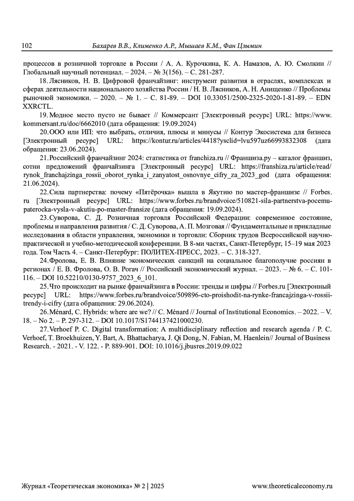 18. Лясников, Н. В. Цифровой франчайзинг: инструмент развития в отраслях, комплексах и сферах деятельности национального хозяйства России / Н. В. Лясников, А. Н. Анищенко // Проблемы рыночной экономики. - 2020. - № 1. - С. 81-89. DOI: 10.33051/2500-2325-2020-1-81-89 EDN: XXRCTL