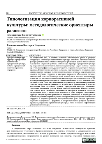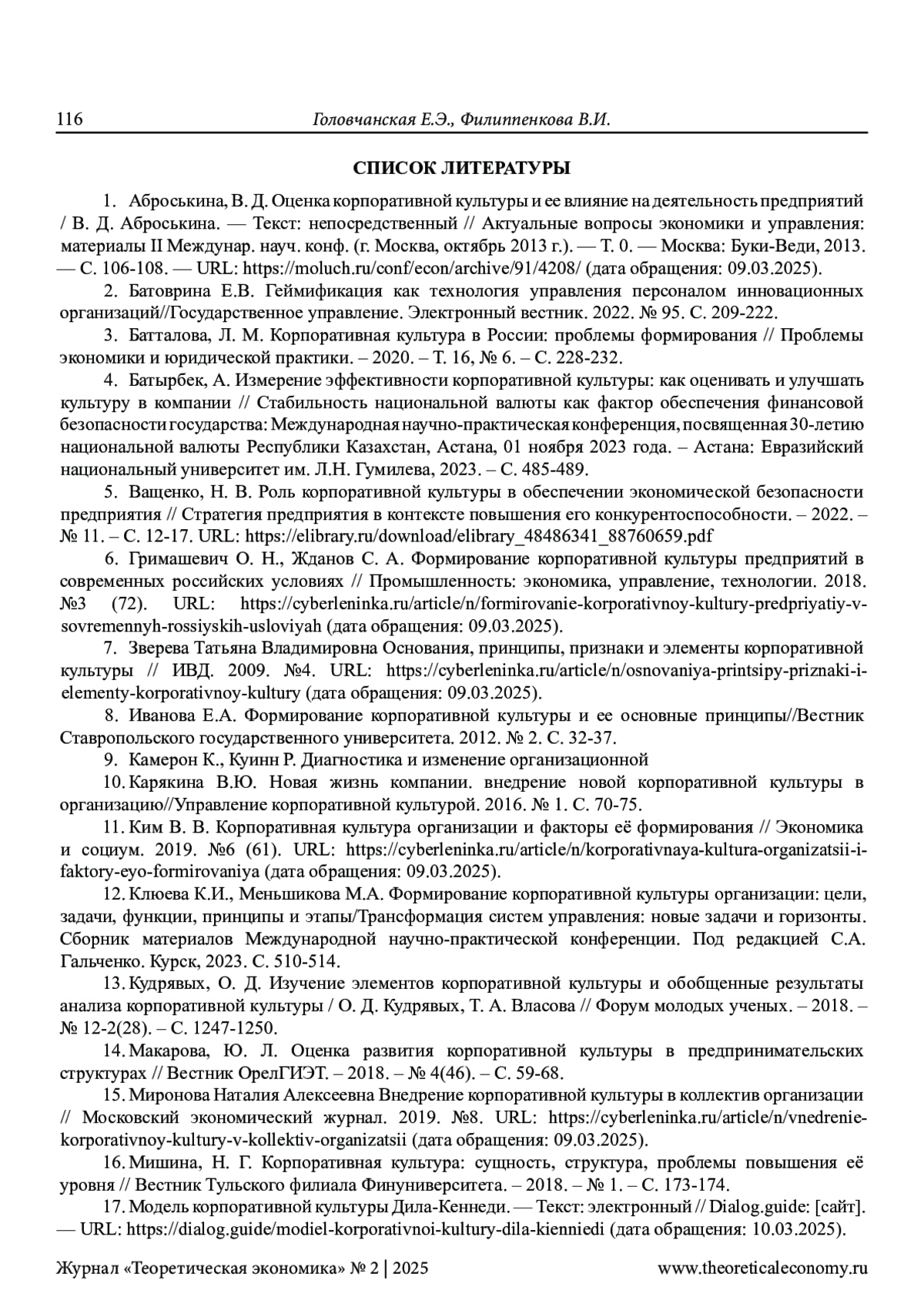 1. Аброськина, В. Д. Оценка корпоративной культуры и ее влияние на деятельность предприятий / В. Д. Аброськина. - Текст: непосредственный // Актуальные вопросы экономики и управления: материалы II Междунар. науч. конф. (г. Москва, октябрь 2013 г.). - Т. 0. - Москва: Буки-Веди, 2013. - С. 106-108. - URL: https://moluch.ru/conf/econ/archive/91/4208/ (дата обращения: 09.03.2025). EDN: SWJPEL