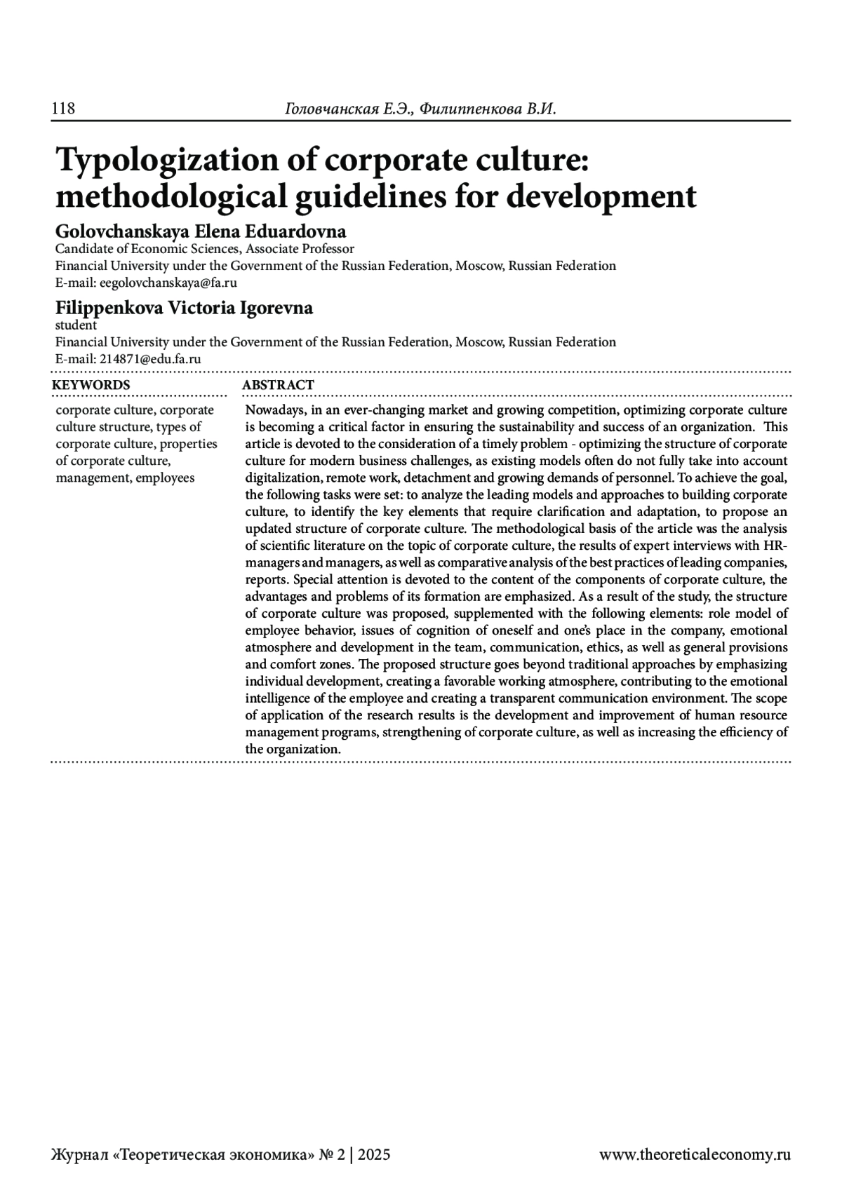 19. Романовская Е.В., Андряшина Н.С., Анисимова А.Е., Закунова Е.Д. Диагностика и оценка влияния организационной культуры на эффективность работы организации//Московский экономический журнал. 2020. № 12. С. 58. ;. DOI: 10.24411/2413-046X-2020-10856 EDN: KLOFKP