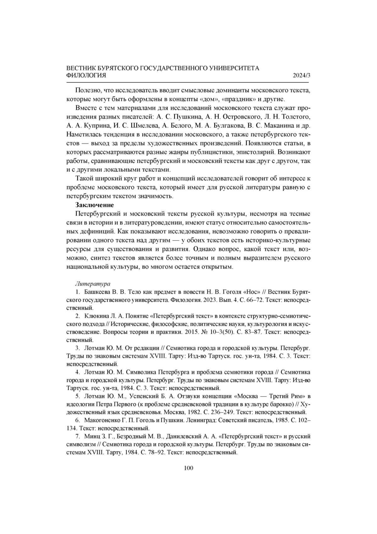 1. Башкеева В. В. Тело как предмет в повести Н. В. Гоголя “Нос” // Вестник Бурятского государственного университета. Филология. 2023. Вып. 4. С. 66-72. Текст: непосредственный.