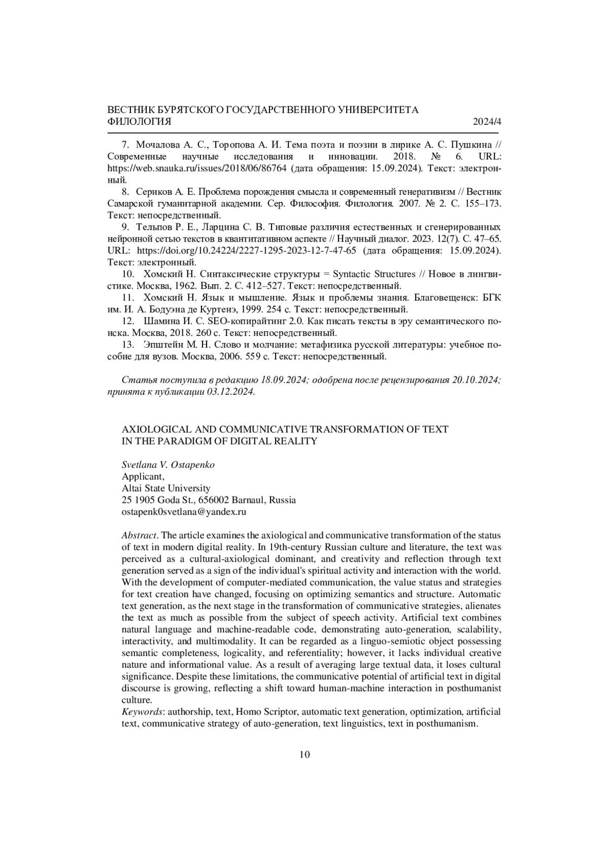 В статье исследуется аксиологическая и коммуникативная трансформация статуса текста в современной цифровой реальности. В русской культуре и литературе XIX в. текст воспринимался как культурно-аксиологическая доминанта, а творчество и рефлексия посредством текстопорождения выступали знаком духовной деятельности личности и ее взаимодействия с миром. С развитием компьютерно опосредованной коммуникации ценностный статус и стратегии порождения текста изменились с фокусом на оптимизацию семантики и структуры. Автоматическая генерация текста, являясь следующим этапом в трансформации коммуникативных стратегий, максимально отчуждает текст от субъекта речевой деятельности. Искусственный текст сочетает естественный язык и машиночитаемый код, демонстрируя автогенерацию, масштабируемость, интерактивность и мультимодальность. Его можно рассматривать как лингвосемиотический объект, обладающий семантической полнотой, логичностью и референциальностью, однако он лишен индивидуальной творческой природы и информационной ценности и, являясь результатом усреднения больших текстовых данных, теряет культурную значимость. Несмотря на эти ограничения коммуникативный потенциал искусственного текста в цифровом дискурсе растет, отражая сдвиг в сторону взаимодействия человека и машины в постгуманистической культуре.