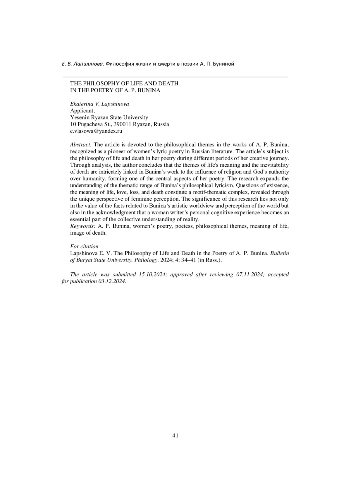 Статья посвящена философской проблематике в творчестве А. П. Буниной, признанной основоположницы женской лирики в русской литературе. Предметом исследования является философия жизни и смерти в ее поэзии в разные периоды творческого пути. В ходе анализа автор статьи приходит к выводу, что темы смысла жизни, неотвратимости конца определенным образом связаны у писательницы с влиянием религии и власти Бога над человеком и являются одними из ведущих в ее творчестве. В результате проведенного исследования расширено представление о тематическом диапазоне философской лирики Буниной. Вопросы бытия, смысла существования, любви, потери и смерти составляют мотивно-тематический комплекс, который раскрывается через уникальную призму женского восприятия. Значимость данного исследования в выбранной области продиктована не только ценностью фактов, касающихся изучения художественного мышления и восприятия мира Буниной, но и тем, что личный познавательный опыт женщины-писателя становится важной составляющей общего опыта осознания окружающей действительности.