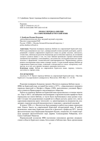 Рецензия посвящена большому проекту Института перевода Библии (далее — ИПБ) на бурятский язык, который был начат в 1975 г. с факсимильного репринта перевода евангелий от Матфея и Марка (1909), выполненных усилиями Иркутского комитета Православного миссионерского общества.