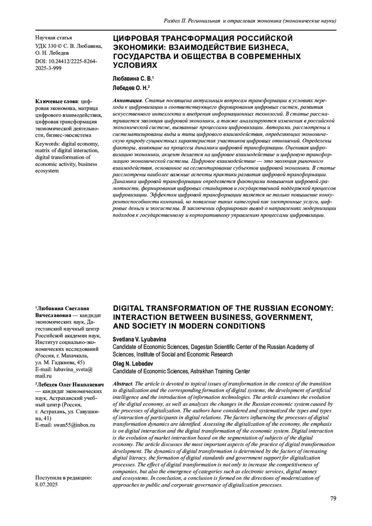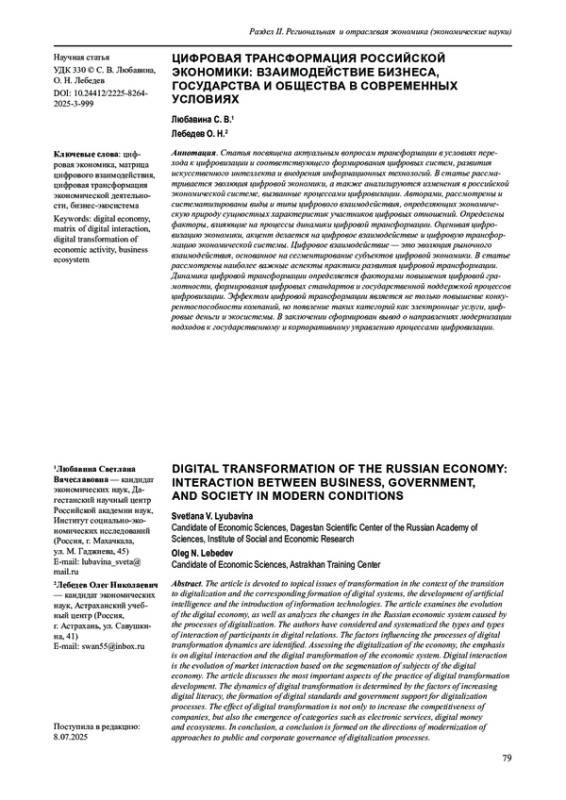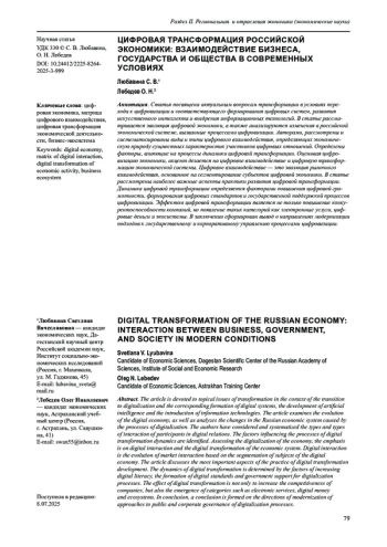 Статья посвящена актуальным вопросам трансформации в условиях перехода к цифровизации и соответствующего формирования цифровых систем, развития искусственного интеллекта и внедрения информационных технологий. В статье рассматривается эволюция цифровой экономики, а также анализируются изменения в российской экономической системе, вызванные процессами цифровизации. Авторами, рассмотрены и систематизированы виды и типы цифрового взаимодействия, определяющих экономическую природу сущностных характеристик участников цифровых отношений. Определены факторы, влияющие на процессы динамики цифровой трансформации. Оценивая цифровизацию экономики, акцент делается на цифровое взаимодействие и цифровую трансформацию экономической системы. Цифровое взаимодействие — это эволюция рыночного взаимодействия, основанное на сегментирование субъектов цифровой экономики. В статье рассмотрены наиболее важные аспекты практики развития цифровой трансформации. Динамика цифровой трансформации определяется факторами повышения цифровой грамотности, формирования цифровых стандартов и государственной поддержкой процессов цифровизации. Эффектом цифровой трансформации является не только повышение конкурентоспособности компаний, но появление таких категорий как электронные услуги, цифровые деньги и экосистемы. В заключении сформирован вывод о направлениях модернизации подходов к государственному и корпоративному управлению процессами цифровизации.