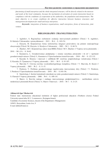 1. Агабеков, С. Региональные особенности создания инновационных продуктов [Текст] / С. Агабеков, Б. Кукурин // Экономика в промышленности. - 2012. - № 4. - С. 149-154. EDN: OXRAMX