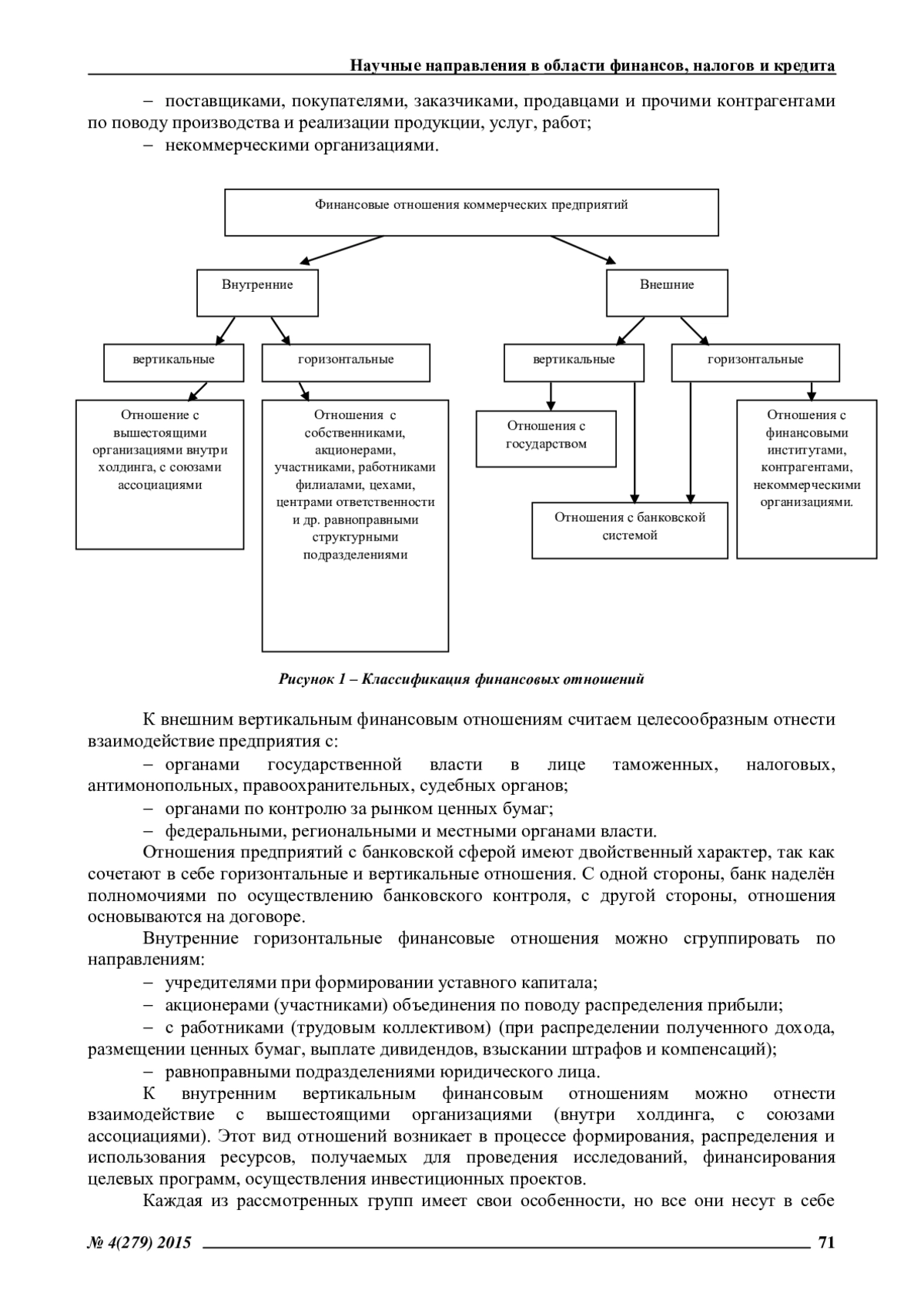 В статье рассматриваются сущность и содержание финансовых отношений, складывающихся на коммерческих предприятиях и являющихся основой построения системы финансового менеджмента. Особое внимание уделено классификации финансовых отношений, в частности выделены 4 группы финансовых отношений, отражающих вертикальную и горизонтальную интеграцию в системе управления финансами предприятия. Выделены основные сущностные признаки финансовых отношений