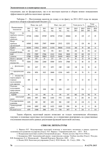 РОМАНОВА Л. Е. НАЛОГОВЫЙ АНАЛИЗ ПОСТУПЛЕНИЙ В ФЕДЕРАЛЬНЫЙ БЮДЖЕТ // ЭКОНОМИЧЕСКИЕ И ГУМАНИТАРНЫЕ НАУКИ. 2015. № 4 (279)