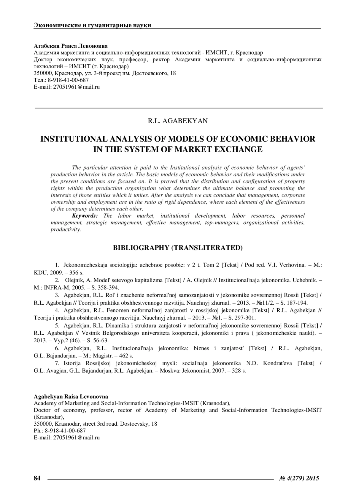 6. Агабекян, Р.Л. Институциональная экономика: бизнес и занятость /Р.Л. Агабекян, Г.Л. Баяндурян. -М.: Магистр. -462 с. EDN: RNBTRH