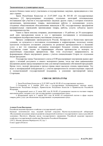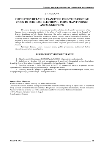 АГАПОВА Е. В. УНИФИКАЦИИ ЗАКОНОДАТЕЛЬСТВА ПО ПЕРЕХОДУ СТРАН ТАМОЖЕННОГО СОЮЗА НА ЭЛЕКТРОННЫЕ ФОРМЫ ЗАКУПОК: ОСНОВНЫЕ ВЫВОДЫ И ПРЕДЛОЖЕНИЯ // ЭКОНОМИЧЕСКИЕ И ГУМАНИТАРНЫЕ НАУКИ. 2015. № 4 (279)